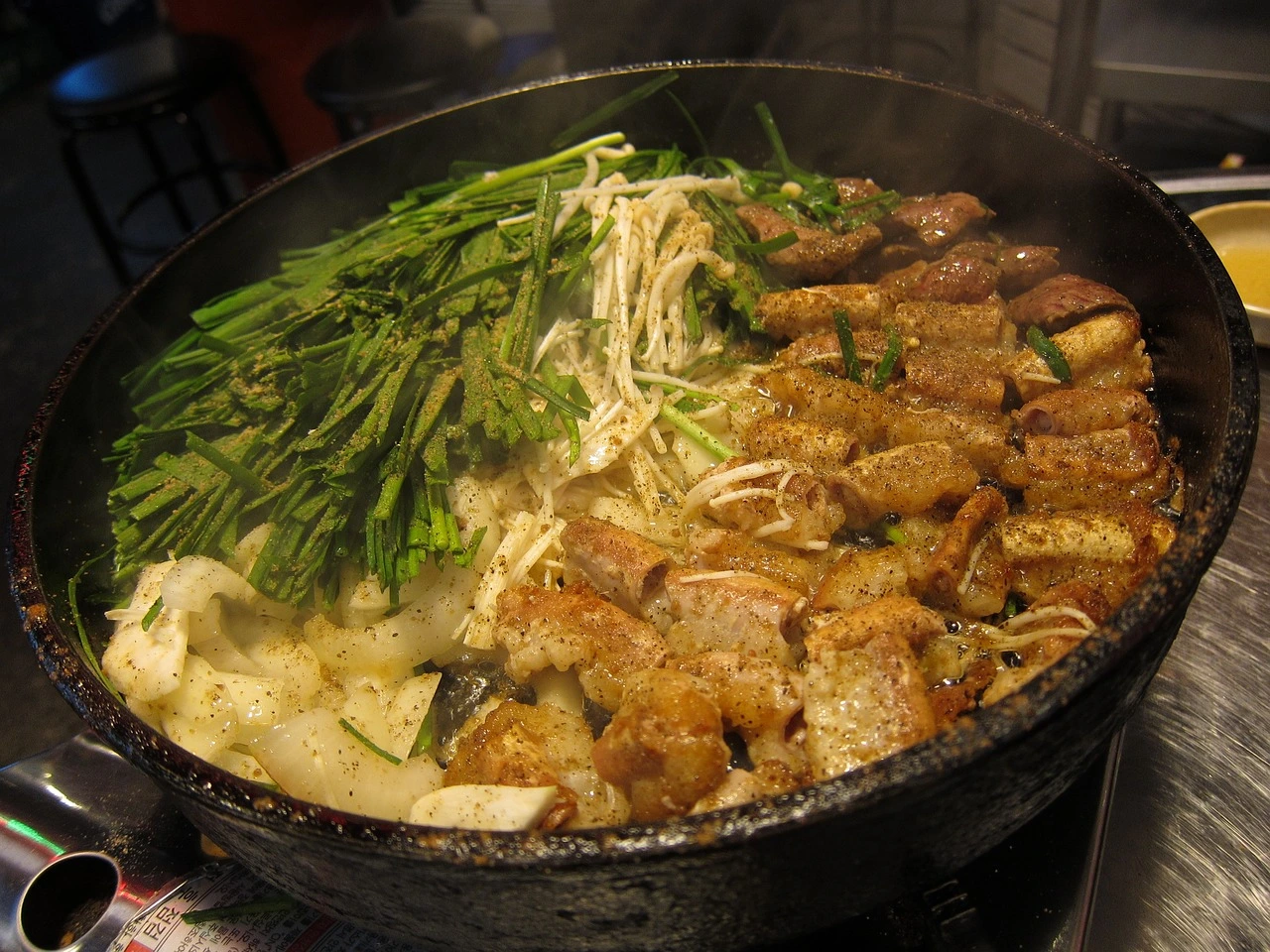 곧 단단하고 까만색의 석쇠가 테이블 한가운데 놓였다. 두툼한 석쇠 위에 둘둘 말린 곱창과 잘라진 양파, 양념된 부추, 생마늘 등등 한국 식당에서 먹는다 해도 믿을 만한 비주얼이었다.