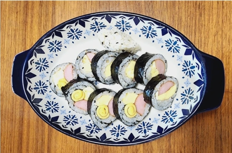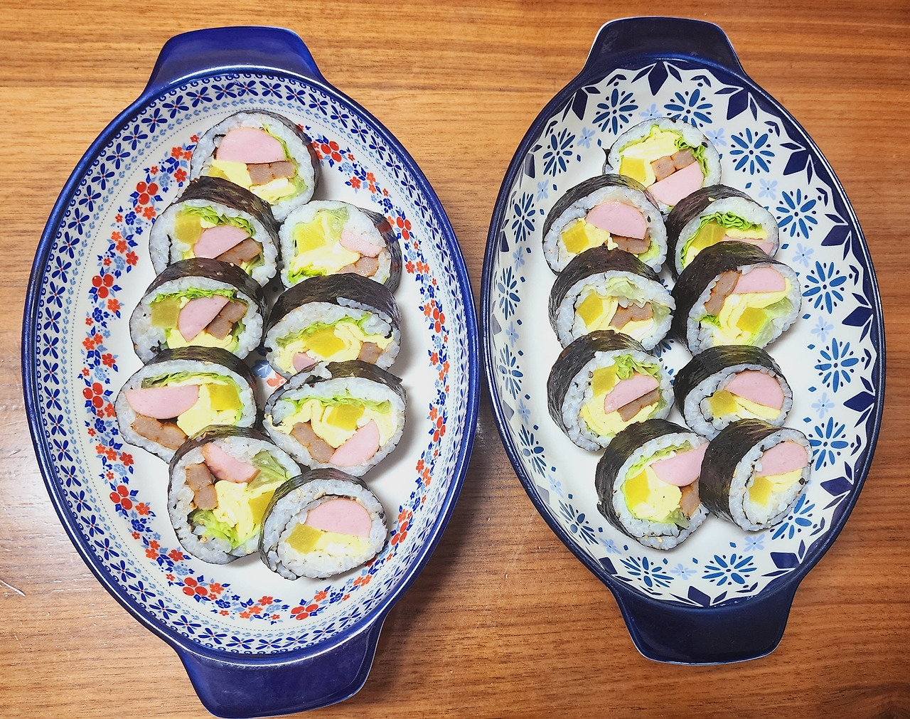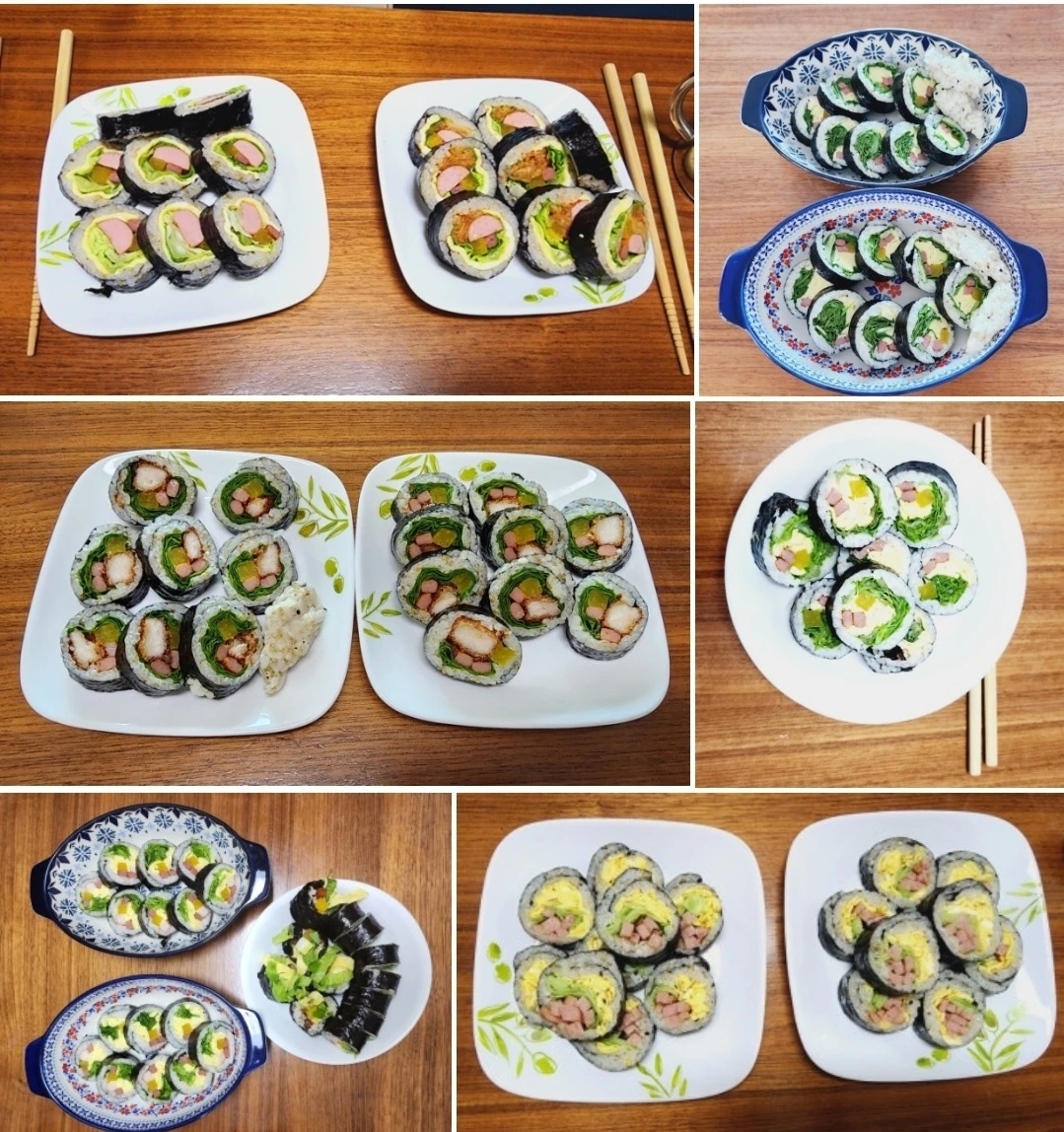 지단을 부쳐 잘게 썰어 잔뜩 넣어도 된다는 걸 알았고(요즘 유행하는 키토 김밥을 동생은 이미 오래전부터), 공식처럼 햄은 가느다란 한 줄만 넣었는데 여러 개 넣고, 소시지도 넣어 애들을 만족시킬 수 있었다.