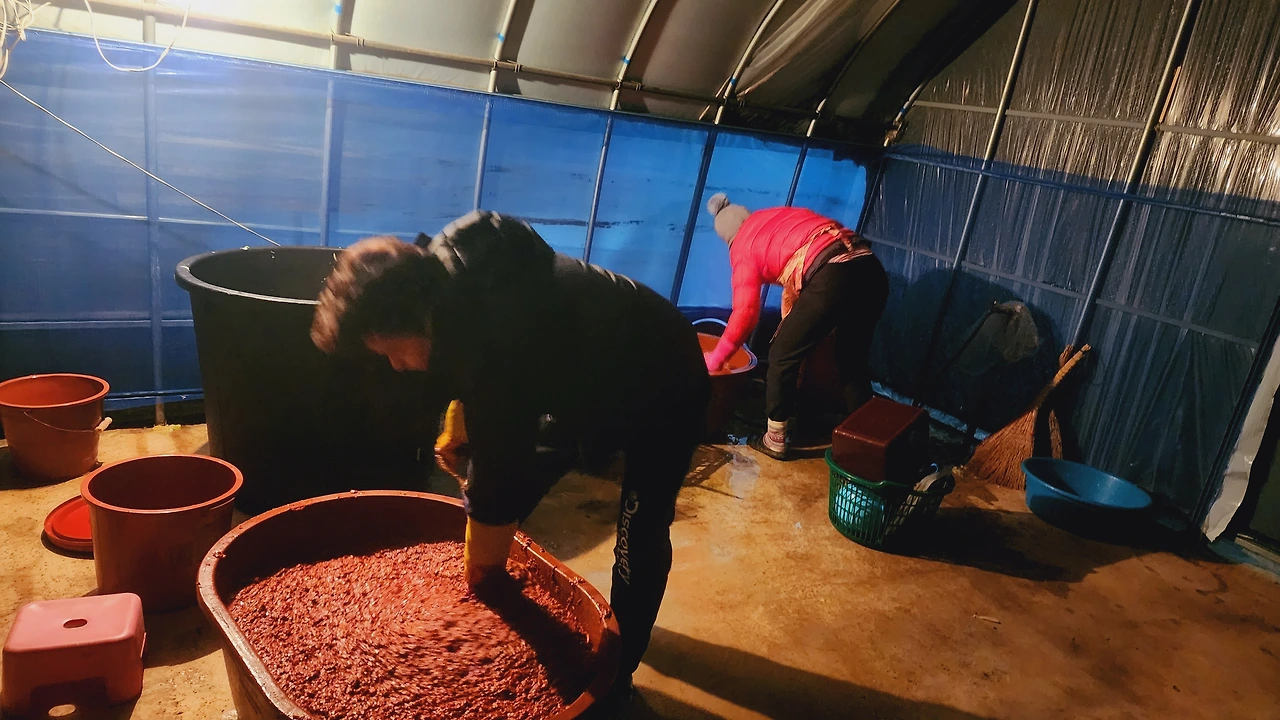 "배추를 잘 절이는 것도 중요하지만, 이 양념맛에 따라 일 년 김치 맛이 결정된다잉."