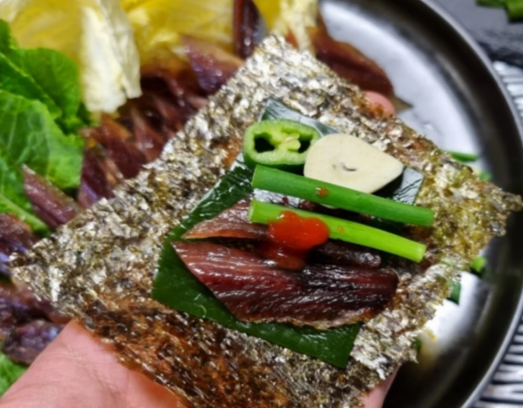 푸릇한 알배추 위에 생김과 미역을 올리고 과메기 한 점, 쪽파와 미나리, 생마늘을 넣고 초장으로 마무리.