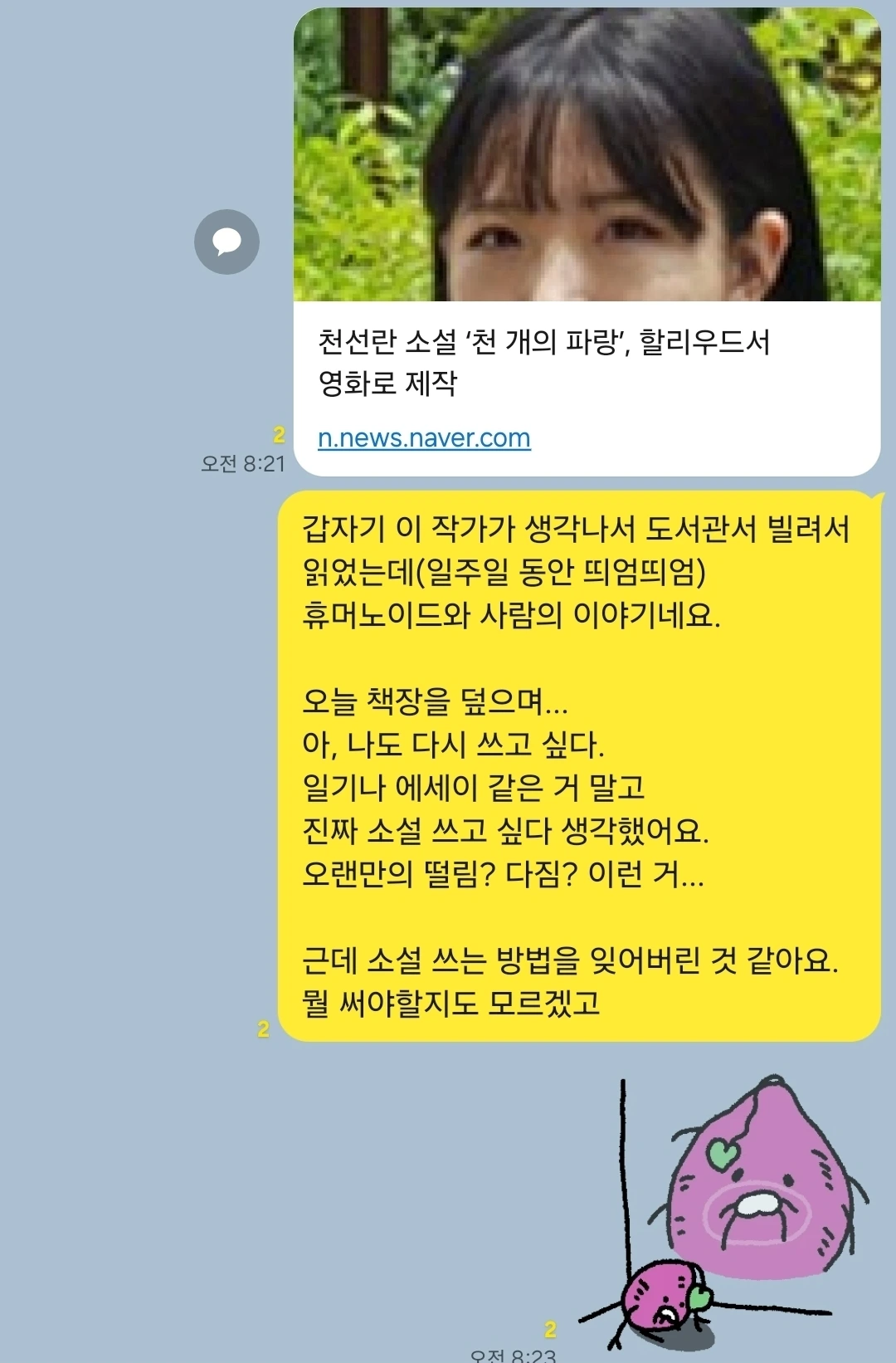 그럼에도... 이제 긴 호흡의 글 쓰는 방법을 잊어버린 것 같다. 또한 긴 글을 쓰기 위해서는 나는 또다시 긴~ 준비를 해야 할 테고, 한번 시작하면 출석도장 찍듯 해내야 한다는 압박감을 가질 테다.