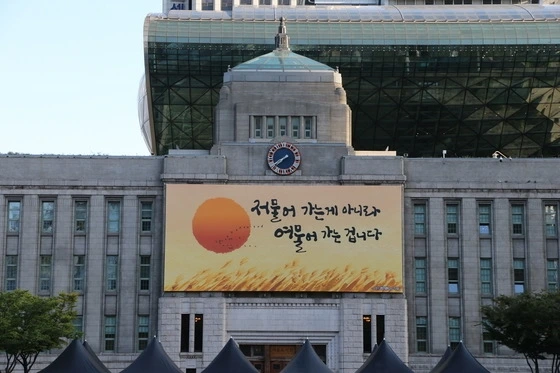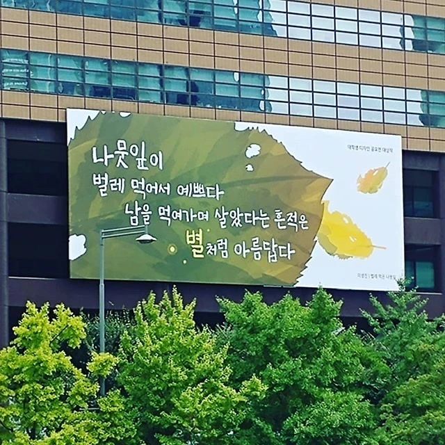아래 사진에서 보시듯 서울시청 글판이나 교보생명 외벽 광화문글판처럼, 아주 짧은 싯구나 좋은 구절이 함께 들어가면 더 좋을 것 같다고 생각합니다. (그러고 보니 이 분야에서 솜씨가 남다르셨던, 고인이 되신 다녕님이 떠오르네요. 어여쁜 문장이 붙은 그분의 그림들을 참 좋아했는데. 아직도 이 글에 답글 달아주실 것 만 같은 다녕님, 부디 편히 쉬시기를.)