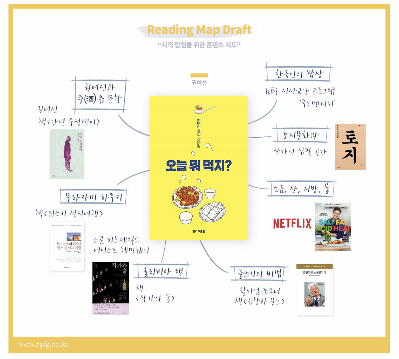 책과 같이 읽으면 좋을 다른 책이나, 연관된 키워드라든가, 연상되는 영화든 장소든 그림이든 시든 뭐든, 함께 보면 좋을 것들을 소개하는 서비스다.