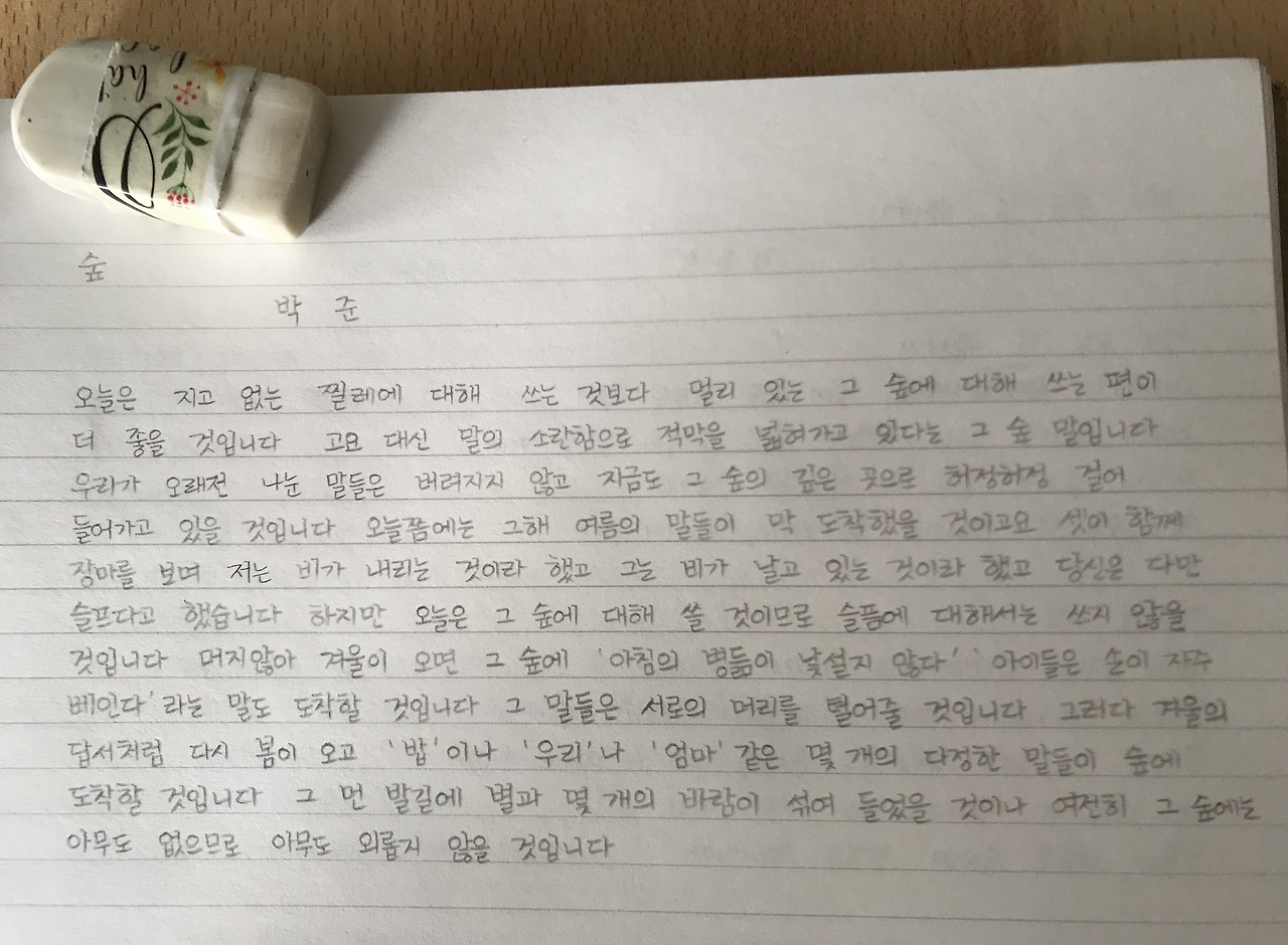 이 시는 필사 모임에 계셨던 분들의 단상들이 모여서 또 하나의 숲이 되는 그 느낌이 너무 좋았어요.
