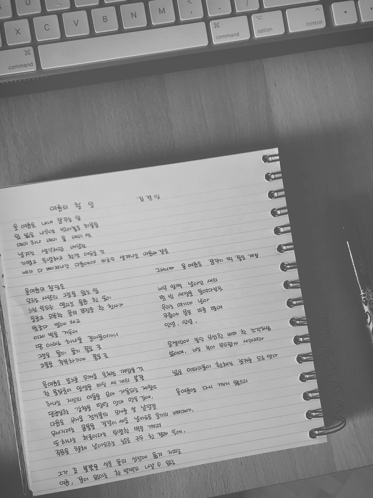 시인은 올여름엔 분노를 두꺼운 옷처럼 껴입고, 깨지 말고 내내 꿈꾸며, 모르는 사람의 그늘을 읽으라 말합니다. 그늘은 둘이 울기 좋은 곳, 고통을 축복하기에 좋은 곳이라고 말하면서요.