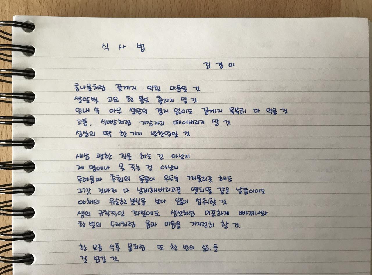 한 벌의 수저처럼 몸과 마음을 가지런히 할 것. 이 시에서 가장 마음에 든 부분이에요. 아침에 일어나 세수를 하고 머리를 단정히 (하고 싶어도 잘 안 되는 사자 갈기 같은 머리를 갖고 있습니다만) 묶으면서 한 벌의 수저를 떠올립니다. 오늘 하루도 겸허히 잘 쓰이는 소박한 도구가 되어야겠다고.