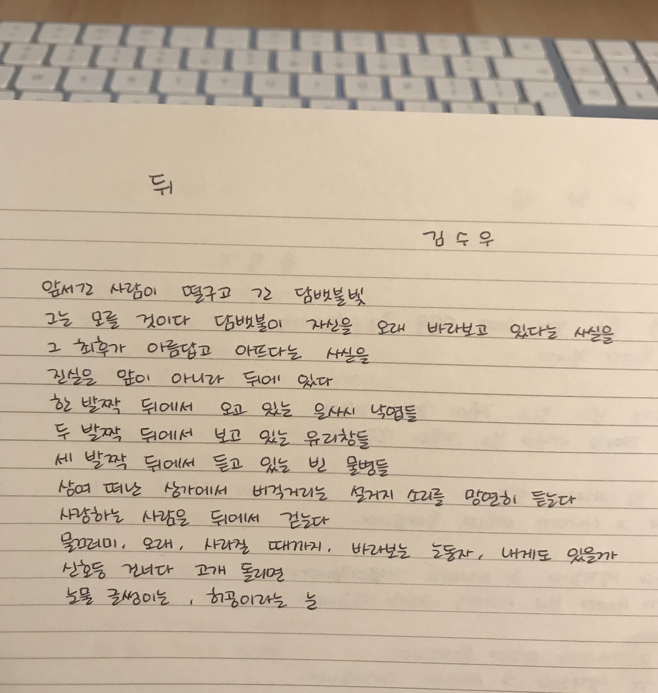 이 부분을 읽으면서 돌아가신 엄마 생각이 나서 살짝 울컥했습니다. 내가 어딜 가든 안 보일 때까지 뒤에 서서 날 바라봐주시던 엄마. 꼬맹이 때부터, 장성한 다음에도, 늘 그렇게 변함없이 뒤에 서서 자식의 뒷모습을 보시는 그 마음은 어땠을까. 엄마를 생각하며 뒤를 돌아보면 “눈물 글썽이는, 허공이라는 눈”을 만나게 되네요. 이 코로나 시국에 부득부득 한국에 돌아온 이유는 사랑하는 엄마의 1주기 때문이기도 했습니다.