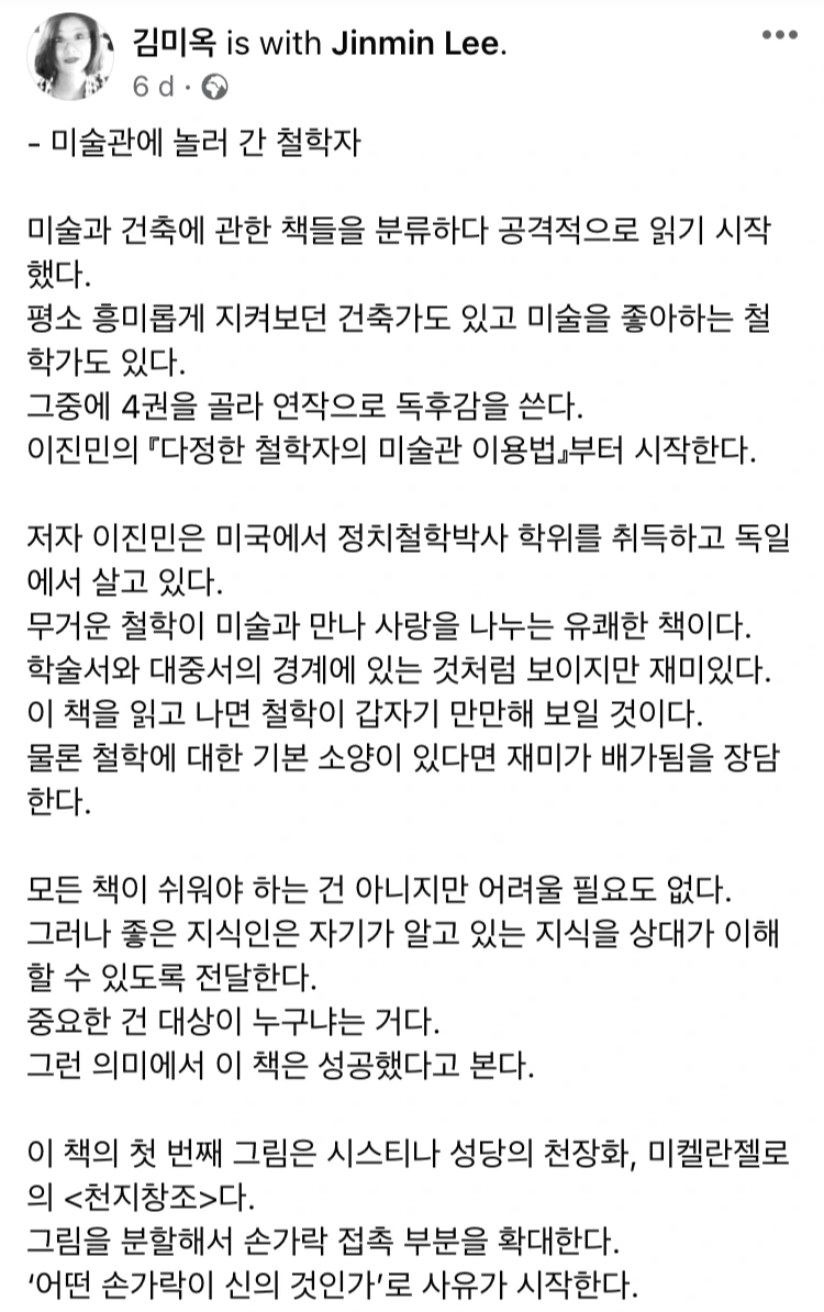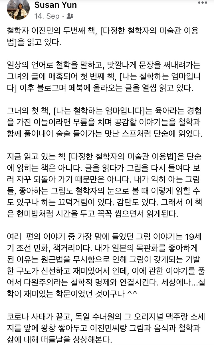 <다정한 철학자의 미술관 이용법> 리뷰들이 소복소복 쌓이고 있습니다. 내가 쓴 책의 리뷰를 읽는 것은 굉장한 용기와 이너 피스를 필요로 하는 일입니다. 학창 시절에 성적표 받을 때의 딱 그 느낌이에요. 다행히 좋은 말씀 해주시는 독자님들이 많아서 감사의 마음을 눌러 담으며 읽고 있습니다.