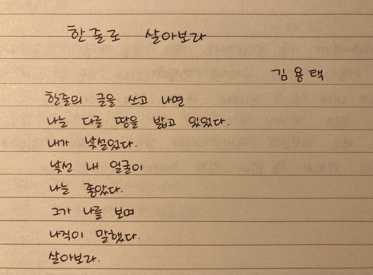 처음에는 '글 한 편도 아니고 한 줄?'이라고 생각했지만 이내 '아 맞아, 한 줄이었지,'하고 생각했습니다. 정말 딱 한 줄로 다른 땅을 밟는 경우가 있으니까요. 마음에 뭔가가 차고 넘쳐 어쩔 줄 모르겠을 때 메모장을 열어 그냥 딱 한 줄 적으면 마음이 바로 가라앉을 때가 있거든요. 말을 고르고 배열해 문장을 만들어 내고 있으면 희한하게 안에서 보글보글 끓던 것들이 물 한 컵 부은 듯 가라앉습니다. 내 안의 어떤 것을 언어화하는 순간에 내 감정과의 거리를 확보하기 때문에, 그렇게 내 감정을 강아지처럼 앞에 두고 살살 쓰다듬을 수 있게 되죠. 그 강아지와 조금 시간을 보내고 나면 '괜찮아, 또 살아보자-' 싶은 생각이 듭니다. 그렇게 또 다른 세계로 넘어갈 수 있는 열쇠가 되어주는 것이 한 줄의 글입니다.