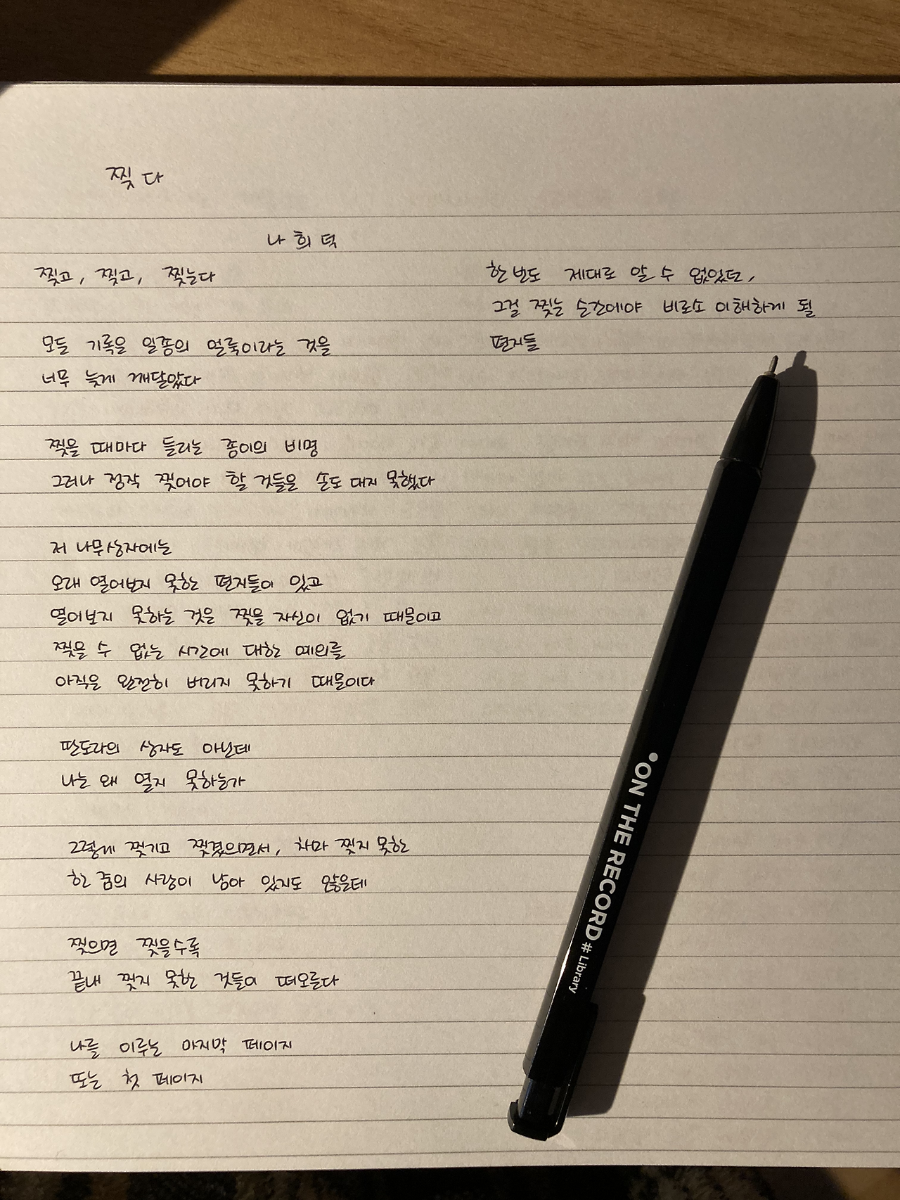 시를 읽는 내내 종이 찢는 소리를 떠올렸어요. 특히 편지를 찢는 소리. 이메일과 파쇄기가 있는 요즘엔 예전처럼 많이 듣지는 못하는 소리죠.