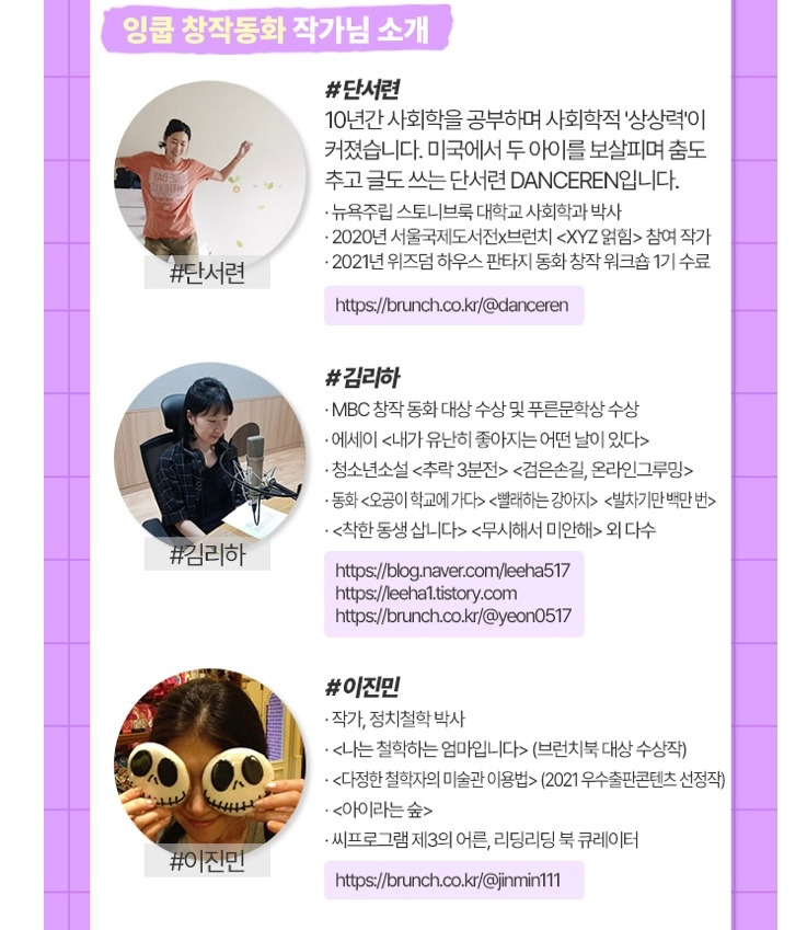 제가 좋아하는 분들을 대거 포섭한 프로젝트이기도 합니다. 인연이 있는 브런치 동화작가님들께 손을 내밀었는데 흔쾌히 잡아주셔서 너무 감사했어요. 사랑스럽고 근사한 그림을 그리는 그림작가님들도 많이 참여하고 계십니다.