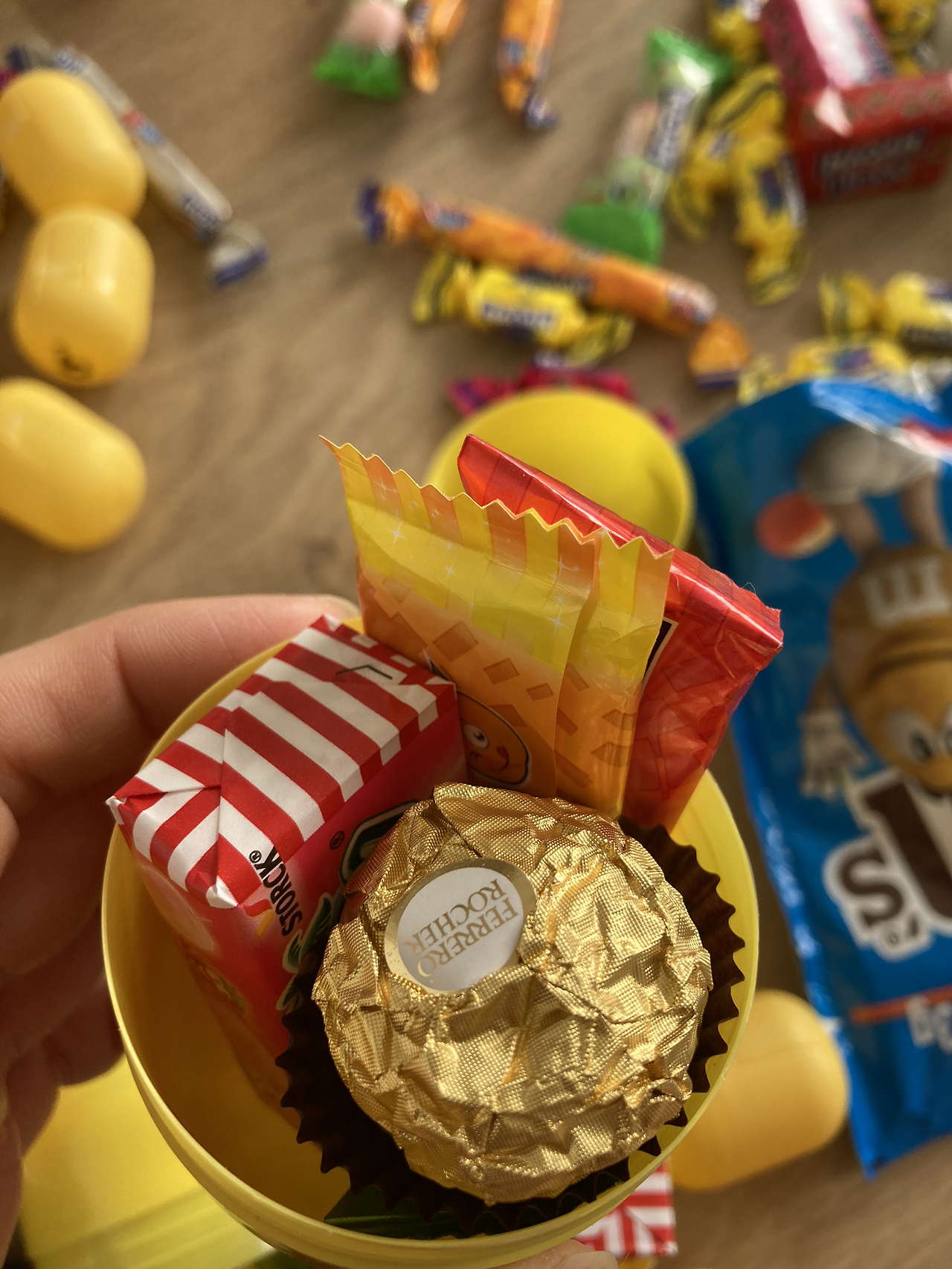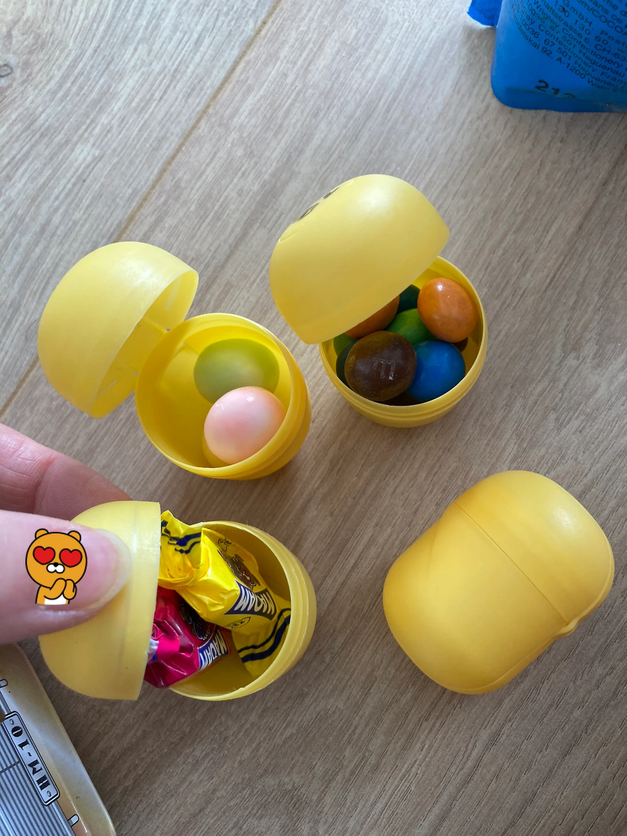 달걀 안에는 까까, 과일류(방울토마토나 포도, 작은 귤 같은 것), 조그만 학용품 등을 넣을 수 있는데요. 이번에는 까까만 넣었습니다.