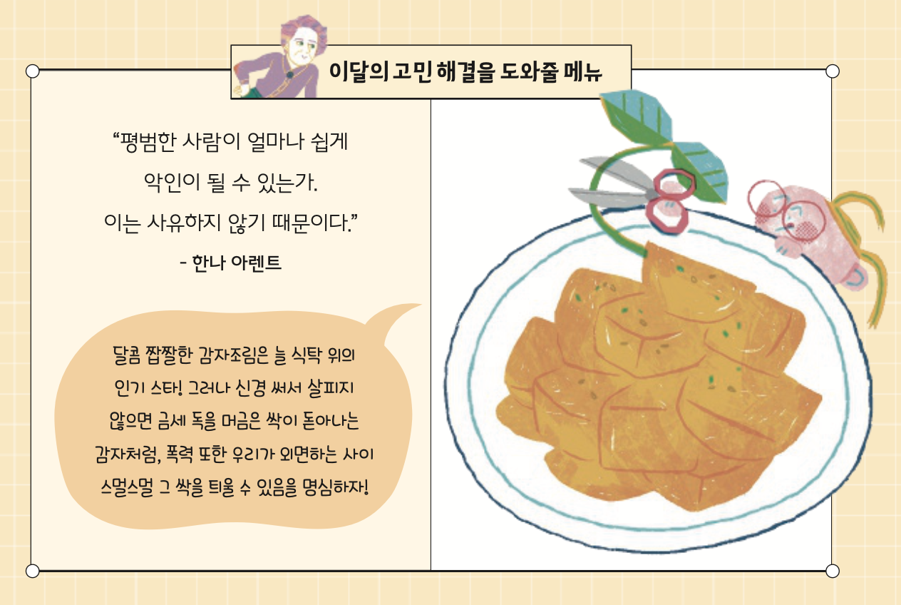 이모네 철학 상담소는 식당도 겸업하는데요, 이달의 고민 해결을 도와줄 메뉴로는 감자조림을 골랐습니다. 잠시 방심하면 금세 독을 머금은 싹이 여기저기 돋아나는 감자처럼, 신경 써서 살피지 않으면 폭력도 그렇게 슬금슬금 싹을 틔울 수 있다는 메시지를 담았어요.