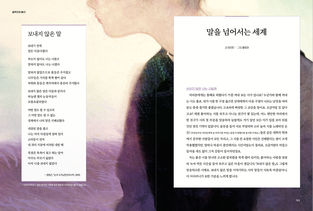 “쓰이지 않은 시는 시가 아닐까요?” 이런 질문을 받은 적이 있어요. <보내지 않은 말>은 그에 답변 삼아 골라드린 시인데 여러분과도 나누고 싶었습니다. “보내기 전에 말은 아름다웠다”, “어떤 말도 될 수 있으며 그 어떤 말도 될 수 없는 경계에서 나의 말은 지혜로웠다”라고 말하는 이 시가 너무도 아름다운 답이 될 것 같았어요.