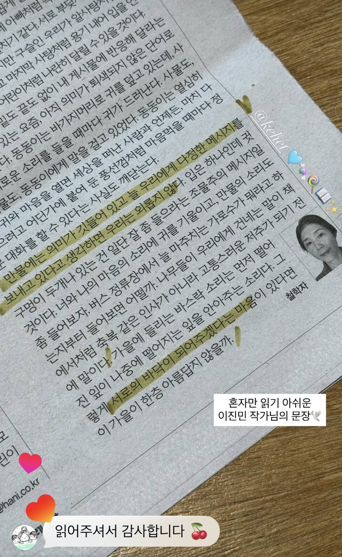 대전에서 버찌책방을 운영하는 다정한 책방지기님께서 소셜 미디어에 사진을 올려주셔서 감사히 구경했어요. 독일에 있으니 신문을 직접 보기 어렵거든요. 이전에도 밝혔듯이 저는 저를 철학자라고 부르시는 분들로부터 최대한 멀리 도피하려는 기본자세를 갖추고 있어 제 사진 옆 세 글자가 영 괴롭네요. (그전에 일단 사진부터 괴롭... 읍읍)
