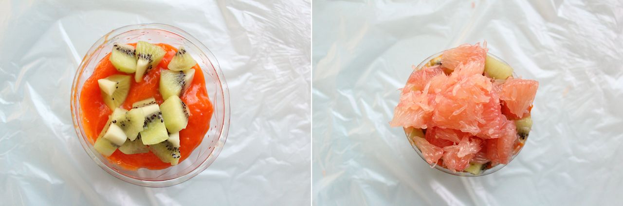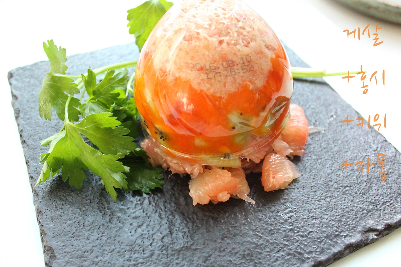 5. 그 위에 잘 으깬 홍시와 키위, 자몽을 올리신 후 접시 위에 뒤집어 엎어주세요.