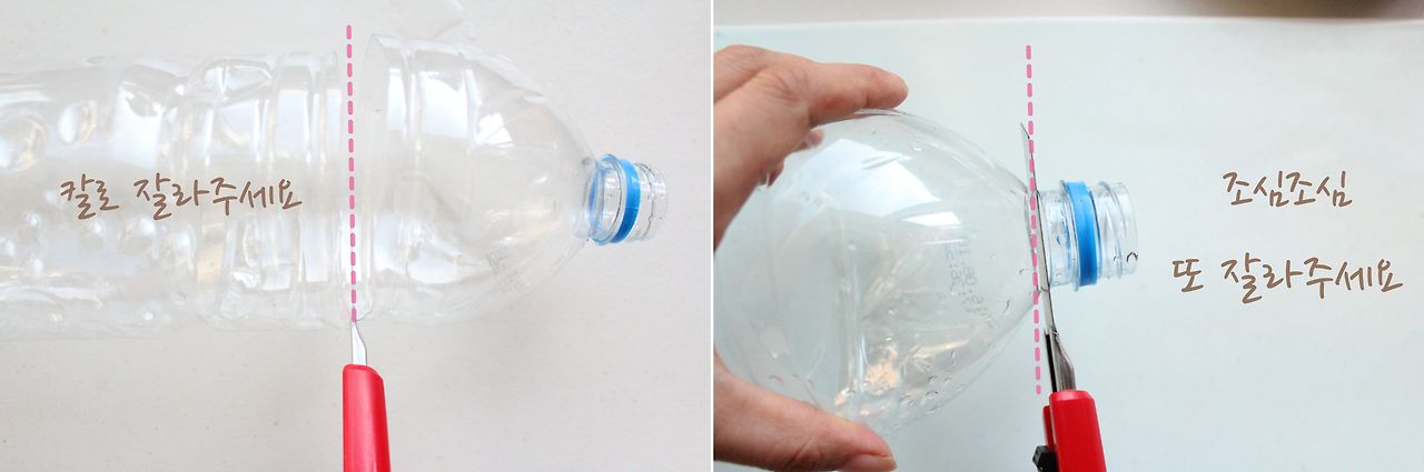 2. 페트병의 입구 부분과 몸통의 1/3 정도 되는 부분을 커터칼로 조심히 잘라주세요.