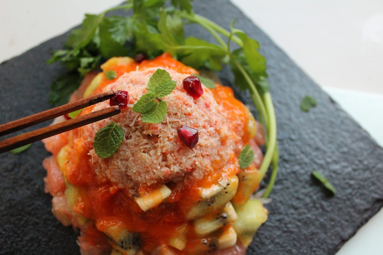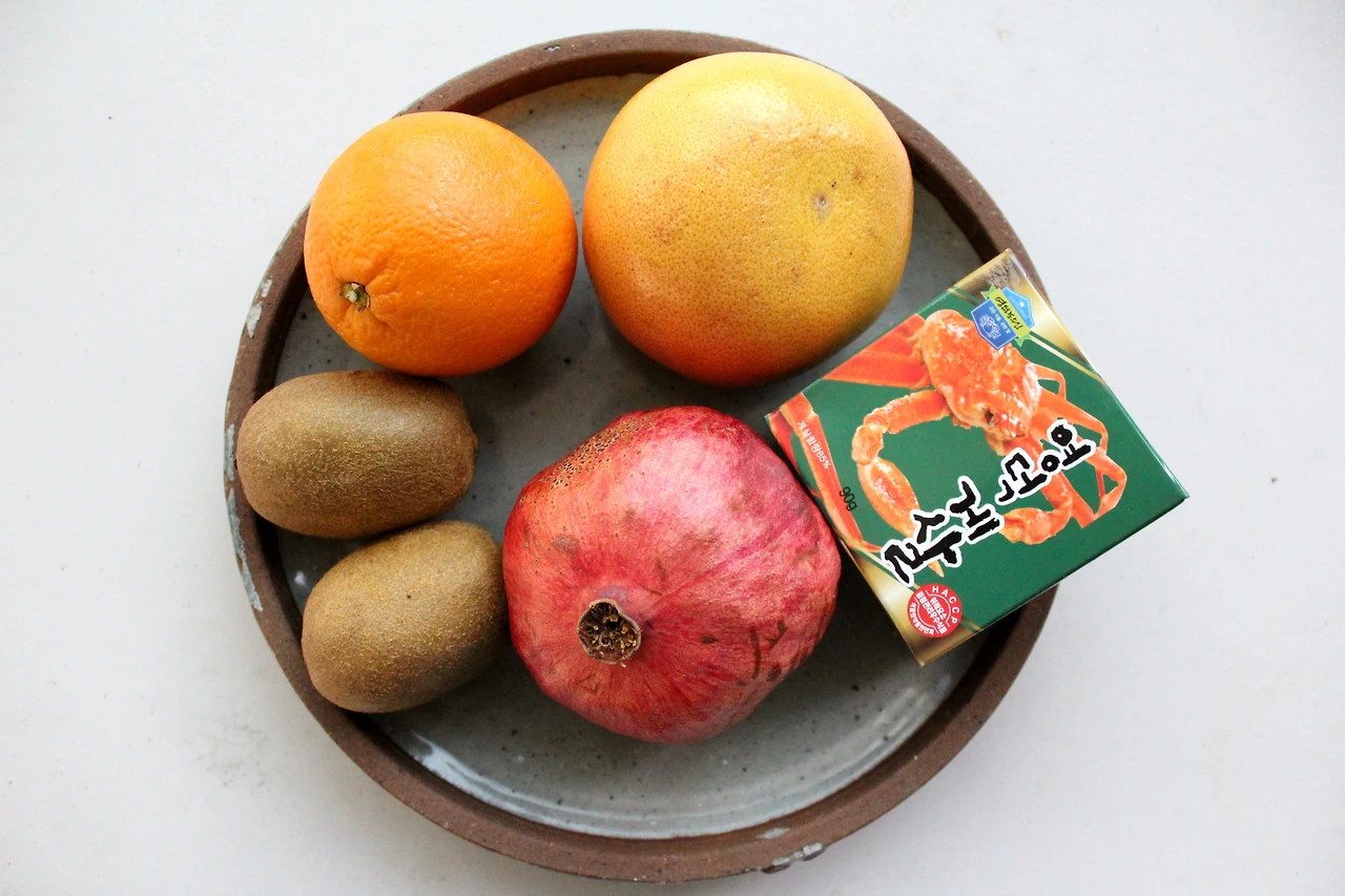 1. 집에 있는 과일과 게살 또는 게맛살을 준비해주세요.