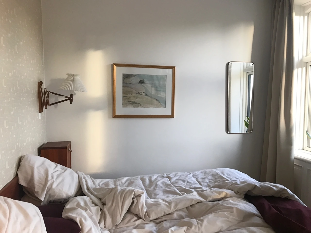 이 방에는 여느 호텔방에 깔려있을 법한 모가 짧은 카펫 대신에 약간 휘고 뒤틀어져 있었던 커다란 널의 나무 바닥이 깔려있었다. 퍽 세련된 느낌은 아닌 애매한 민트색의 잔무늬 벽지가 발라져 있었고, 지그재그 나무다리를 가진 클래식한 벽부등 두 개가 달려있었다. 붉은빛이 살짝 도는 깊은 나무색의 침대 헤드는 지난밤의 흔적으로 잔주름이 가득 져있는 흰 침대보를 어떤 소설 속의 순간처럼 보이게 했다. 전신 거울이 없어서 옷장문 안쪽에 달린 거울을 찾아내어 문을 열고 매일매일의 옷 입은 기록을 남기기 시작한 것도 이 작은 호텔방에서였다. 그때쯤이면 아주 커다랗지는 않았던 소소한 불편함들이 밉지 않게 되고, 아담한 방의 크기마저도 클래식하게 느껴지는 것이다.