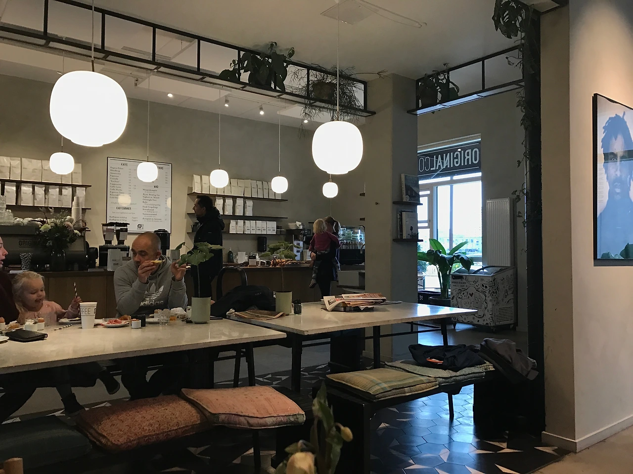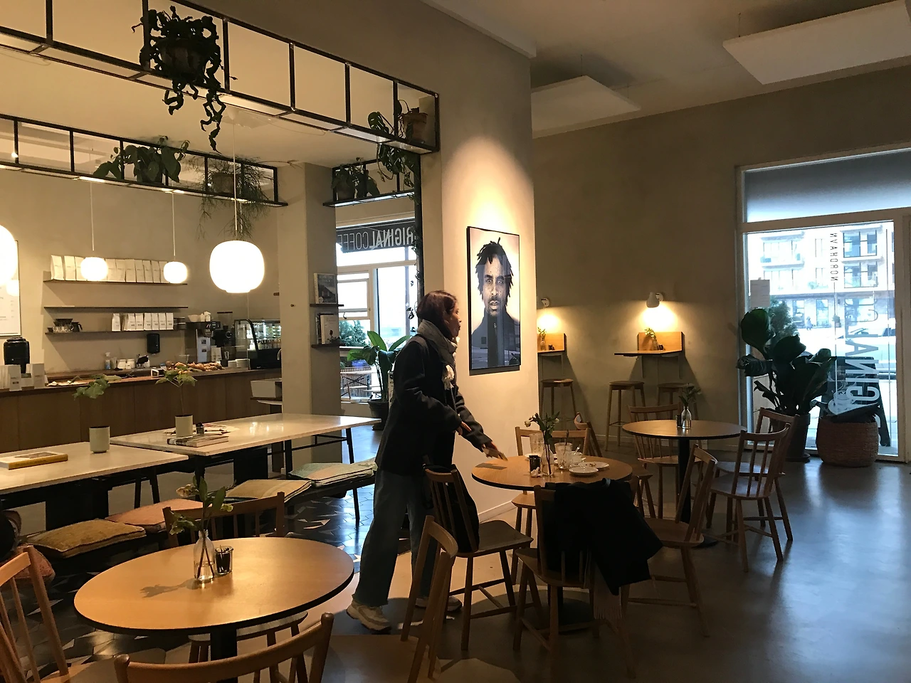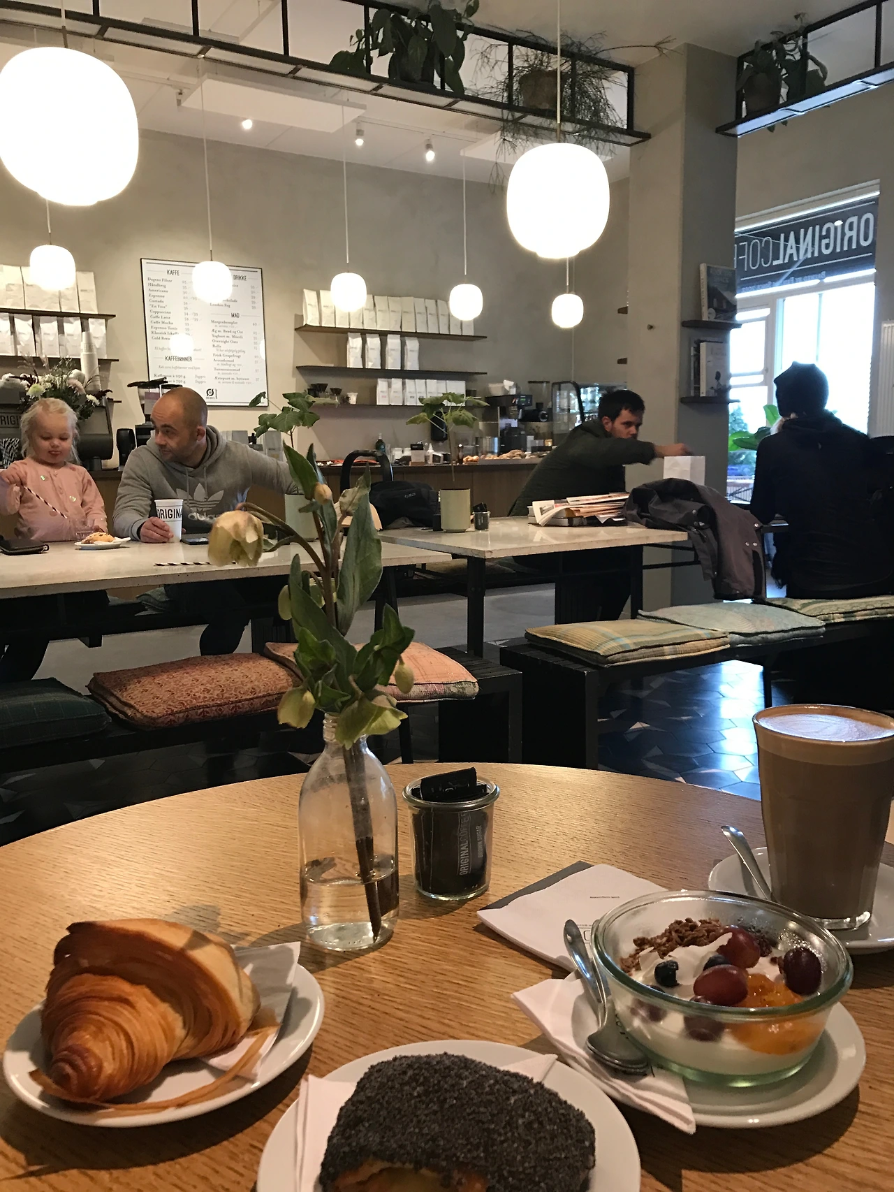 카페 안에는 나무로 된 4인용 테이블이 서너 개 정도 있고, 카운터 쪽에는 기다란 커뮤널 테이블이 놓여있어서 마주 보고 앉는 벤치 위에는 방석 같은 쿠션들이 놓여있다. 벽면을 따라서는 바 테이블이 벽에 달려서 고정되어있는데, 혼자 카페에 와서 선 채로 신문을 보거나 노트북을 하는 남자 손님들에게 인기가 많았다. 우리는 나무로 된 원형 식탁에 앉았다. 가운데에 있는 기다란 벤치 자리는 아이를 데려온 가족들에게 인기가 많은 듯 보였다. 카페 안은 나무로 만든 가구들이 놓여있고 곳곳에 식물이 많아서 따뜻하고 다정한 분위기였다. 가장 인기가 많은 가운데 커뮤널 테이블 자리를 빙 둘러서 천정에 선반이 달려있는데, 그 위에도 살아있는 화분들이 많이 올라있다. 아침마다 사다리를 타고 올라가서 물을 주는 장면을 상상해보기도 했다.