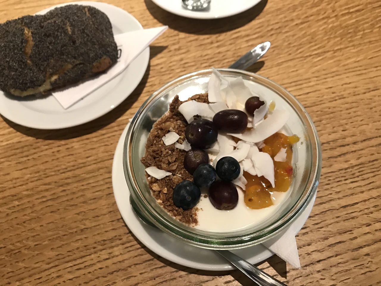 겹겹이 파삭하고 부서지는 플레인 크루아상과 슈가 들어가 있는 검정색 데니쉬 페이스트리, 진한 라테와 요거트를 아침으로 시켜먹었다. 가장 기억에 남는 건 요거트였다. 농도가 아주 진하고 그 안에 들어가는 바삭바삭한 식감의 뮤즐리, 홈메이드 느낌의 살구 쨈, 포도 몇 알, 코코넛 플레이크가 밸런스를 이룬 완전체였다. 요거트를 즐겨먹지 않는 나에게도 놀라운 맛이었다. 이때 알게 된 요거트 먹는 방식을 집으로 돌아온 뒤에도 한동안 이어갔다. 집에서 만든 무화과잼을 플레인 요거트에 넣어서 먹는 것은, 코펜하겐에서 발견해온 근사한 아침 리추얼이자 소박한 사치가 되었다.