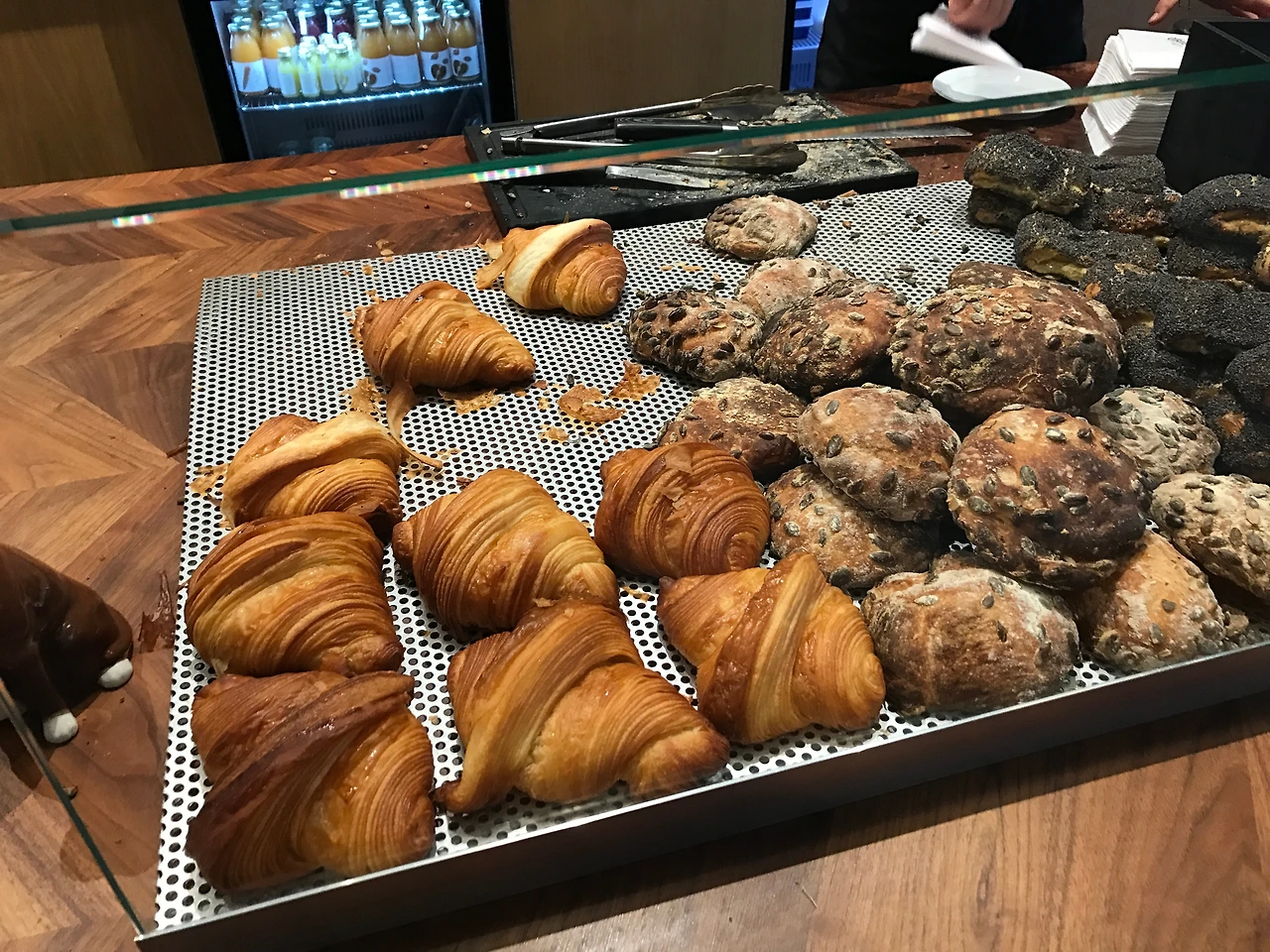 카운터는 제법 길었다. 한켠에는 과일이나 뮤즐리 등 함께 곁들여먹는 재료들을 올려서 미리 담아둔 요거트가 신선한 모습을 하고 쇼케이스 안에 담겨있다. 그 옆에는 갓 구워서 나온 페이스트리들이 철판 위에 차곡차곡 쌓여있다. 빵은 3가지 종류였는데, 플레인 크루아상과 씨앗이 잔뜩 붙어있는 투박한 모습의 어떤 빵, 그리고 코펜하겐의 어느 빵집에서나 찾아볼 수 있었던 검정색 곡물가루가 새카맣게 잔뜩 붙고 그 안에는 달콤한 슈크림이 들어있는 데니쉬 페이스트리가 있었다. 페이스트리 카운터가 끝나는 지점에 주문을 할 수 있는 곳이 있고, 그 옆으로는 두 종류의 다른 원두가 들어있는 그라인더와 에스프레소 머신이 놓인 기다란 카운터가 계속 이어진다.