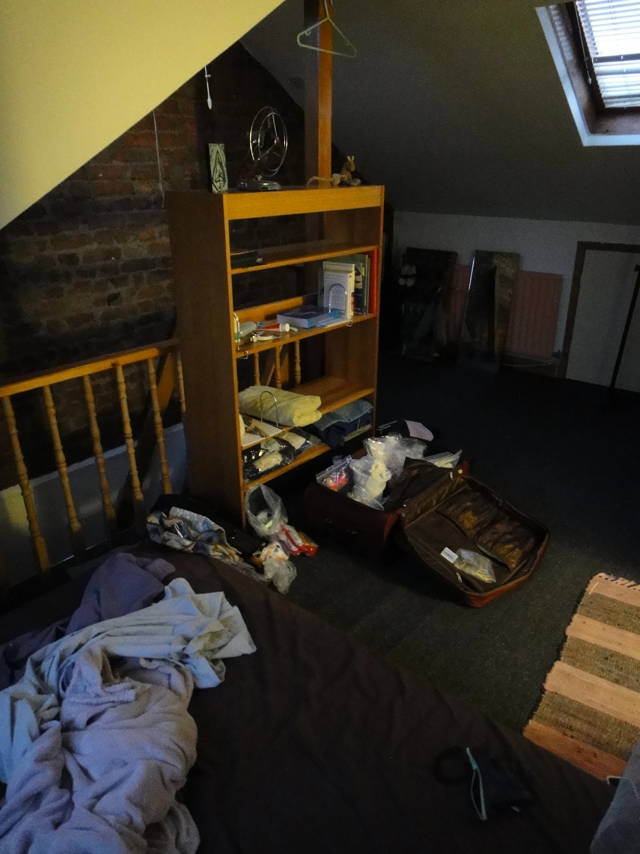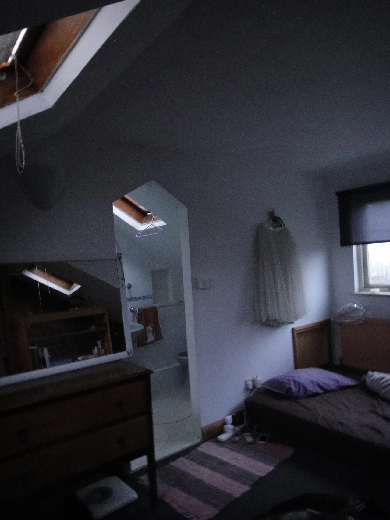 다락방에는 문이 없는 대신에 앞뒤가 뚫린 나무 선반 하나가 계단 난간에 기대서 우뚝 서 있었는데, 그 선반은 마치 나에게 방문과 같은 안정감을 주었다. 바닥에는 카펫이 깔려있었고, 그걸 맨발로 밟는 느낌이 낯설었다. 창가 바닥에는 매트리스가 놓여있었다. 그 머리맡에는 발레 튀튀 스커트가 걸려있었는데, 그 장면이 낭만적이라 생각했다. 그리고 신기하게도 문이 없이 뻥 뚫린(!) 욕실이 있었다. 그래서 누군가 샤워를 할 때면 방을 내어주고 아래로 내려가서 피해있곤 했다. 문이 달려있던 흔적도 없었다. 굳이 문을 달지 않고 나처럼 지냈을 사람들의 모습이 왠지 상상되어 귀엽기도 하고 웃음이 나왔다.