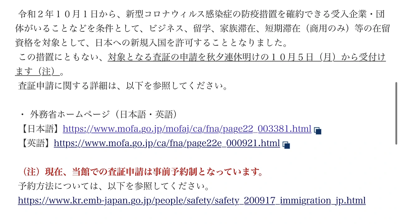 ○ 이미 대사관에 사증을 신청한 분에 대해서도, 10월 1일부터의 새로운 조치에 따라 받아들이는 기업 / 단체가 작성한 ‘서약서’의 제출이 필요합니다....(중략).... 또한 일본 정부에 의한 사증 제한 조치(3월 8일) 이전에 사증을 교부받았으나, 사용하지 않은 경우에는 사증의 유효기간에 관계없이 새롭게 사증을 신청해 주시기 바랍니다.
