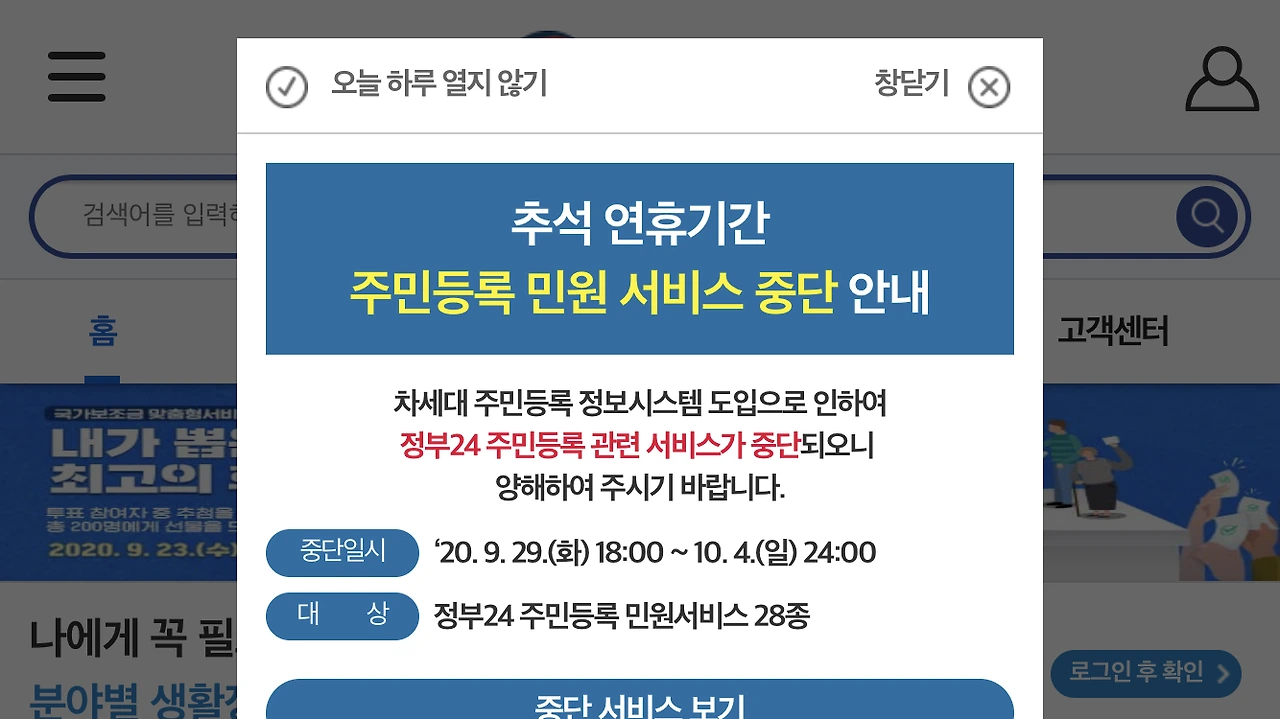 먼저, 컴퓨터를 켜고 '정부24'홈페이지에 접속했다. 우선은 인터넷으로 발행할 수 있는 서류들을 발급하기 위해서였다. 팝업 창이 떴다. 맙소사! 한가위 연휴 기간에 대대적인 시스템 유지보수 작업을 한다는 공지였다. 인터넷을 통한 민원서류 발급 서비스가 정지되는 것은 물론이고, 전국 곳곳에 설치된 무인민원발급기의 모든 서비스 역시 중단된다는 것이었다. 서비스 중단은 은 10월 4일 밤 12시까지. 남의 도움 없이 준비할 수 있는 서류라도 미리 준비하려 했지만, 뜻처럼 쉽지 않았다. 5일 아침이 되어야만 비자 신청을 위한 최소한의 서류들을 뗄 수 있는 상황이었다.