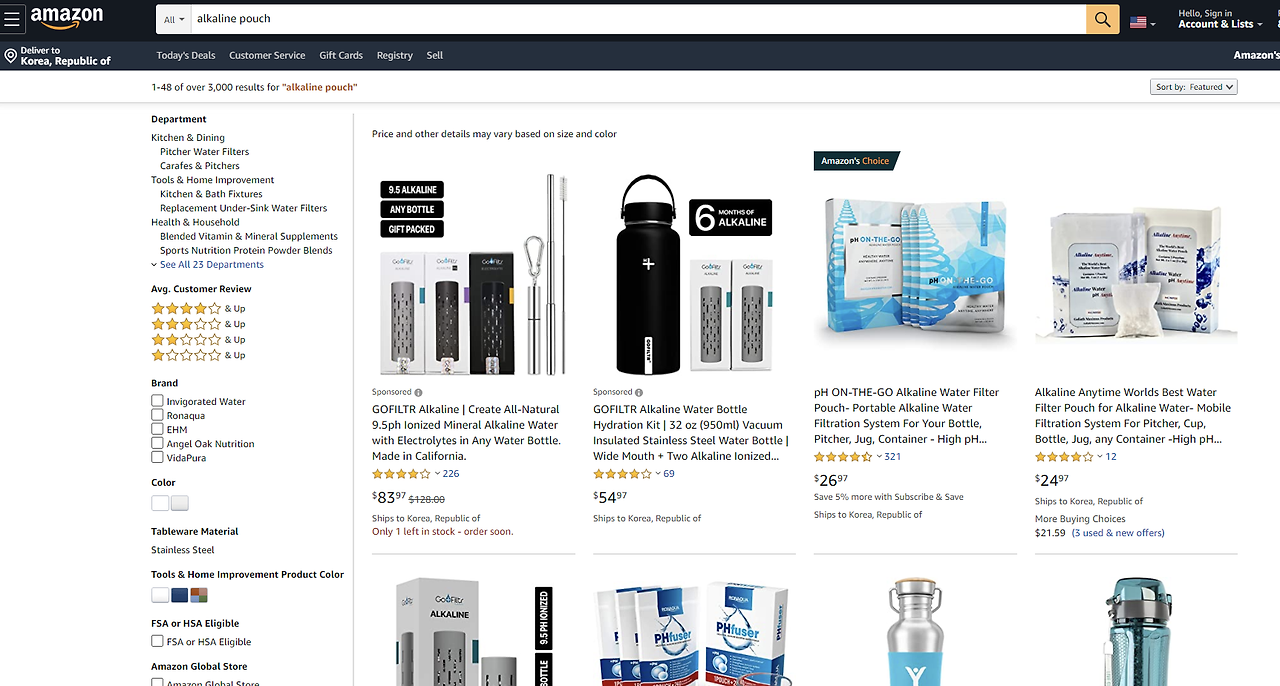 구글이나 아마존에서 Alkaline Pouch로 검색되는 검색결과만 좀 들여다봤으면 눈치챘을 것이다. 타사의 경우 ph-on-the-go나 ph fuser, alkaline anytime, gofiltr등의 제품명으로 시선을 끌면서 alkaline pouch로 검색하면 최상단에 뜨는 전략을 택했다. 국내에서도 커머스 좀 한다는 사람들은 일반적으로 그런식으로 검색광고를 한다는 걸 쉽게 알 수 있다.
