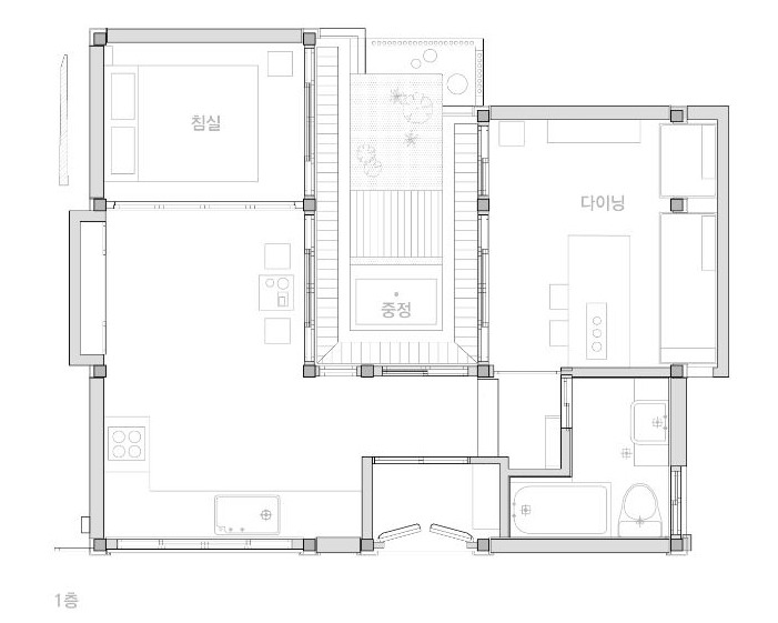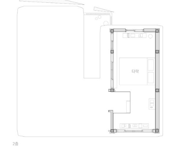 위 도면에서 보면 알 수 있듯이 출입구를 지나면 '주방', '침실', '다이닝룸', '화장실', 그리고 모든 공간이 접해있는 '중정'이 나온다. '화장실'위에는 작은 '다락방'이 있는데 이곳마저 작은 창을 내어 중정을 바라볼 수 있도록 했다. 면적은 12평도 채 되지 않기 때문에 공간의 구성이 다양하진 않지만, 모든 공간은 책을 가까이하기 쉽도록 구성되어 있다. 책을 읽거나 글을 쓸 수 있는 넓은 테이블, 작은 창을 바라보며 독서와 나만의 시간을 가질 수 있는 다락방, 큰 창에서 쏟아지는 빛을 받으며 책을 즐길 수 있는 침실 등 모든 공간을 독서를 하기에 불편함이 없다. 브랜드 방향과 같이 책과 함께 온전한 휴식을 즐기고 싶은 사람들에게는 굉장히 포근하고 아늑한 공간으로 다가올 것이다. 또 모든 공간에는 서촌의 '한 권의 서점'이라는 책방에서 큐레이션 했던 도서들을 볼 수 있다. '한 권의 서점'은 매달 한 권의 책을 선정해 판매하는 콘셉트를 가지고 있는 책방인데 전문 큐레이터의 검증된 책을 볼 수 있다는 것도 큰 매력으로 다가왔다.