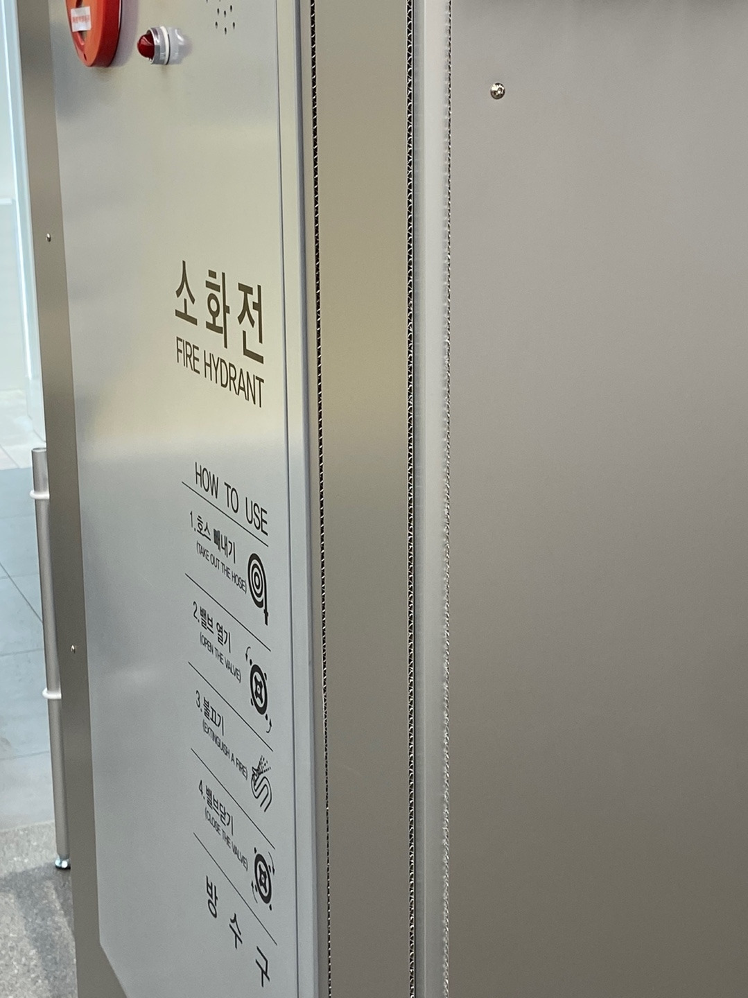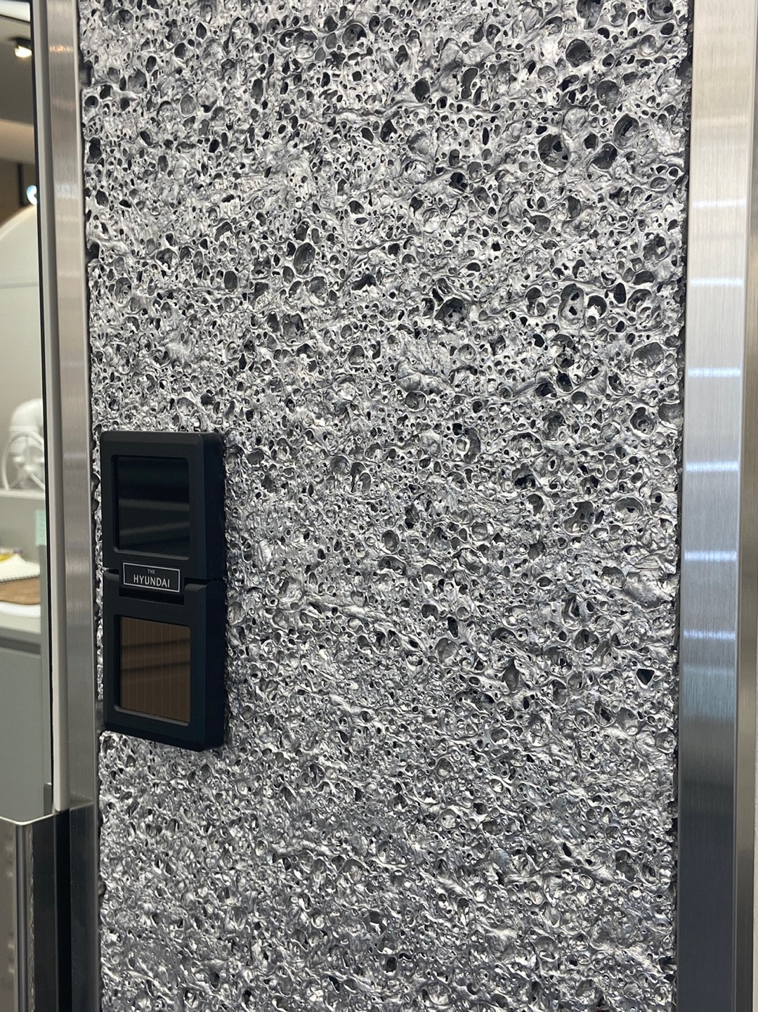 발포금속은 알루미늄 재료를 고온으로 녹여 가스로 발포시킨 다공질 패널이다. 건축 내장재로는 많이 사용되는 것 같은데, 마감재에 사용한 건 현대백화점 판교에서 처음 보았다. 멀리서 보았을 때 구겨진 포일 같기도 하고, 가까이서 보면 현무암 같이 여러 공극이 있다. 이미지에서도 느껴지듯이 마감재 자체가 굉장히 거칠기 때문에 사람의 몸이 자주 닿지 않는 곳에 사용해야 할 것 같다.