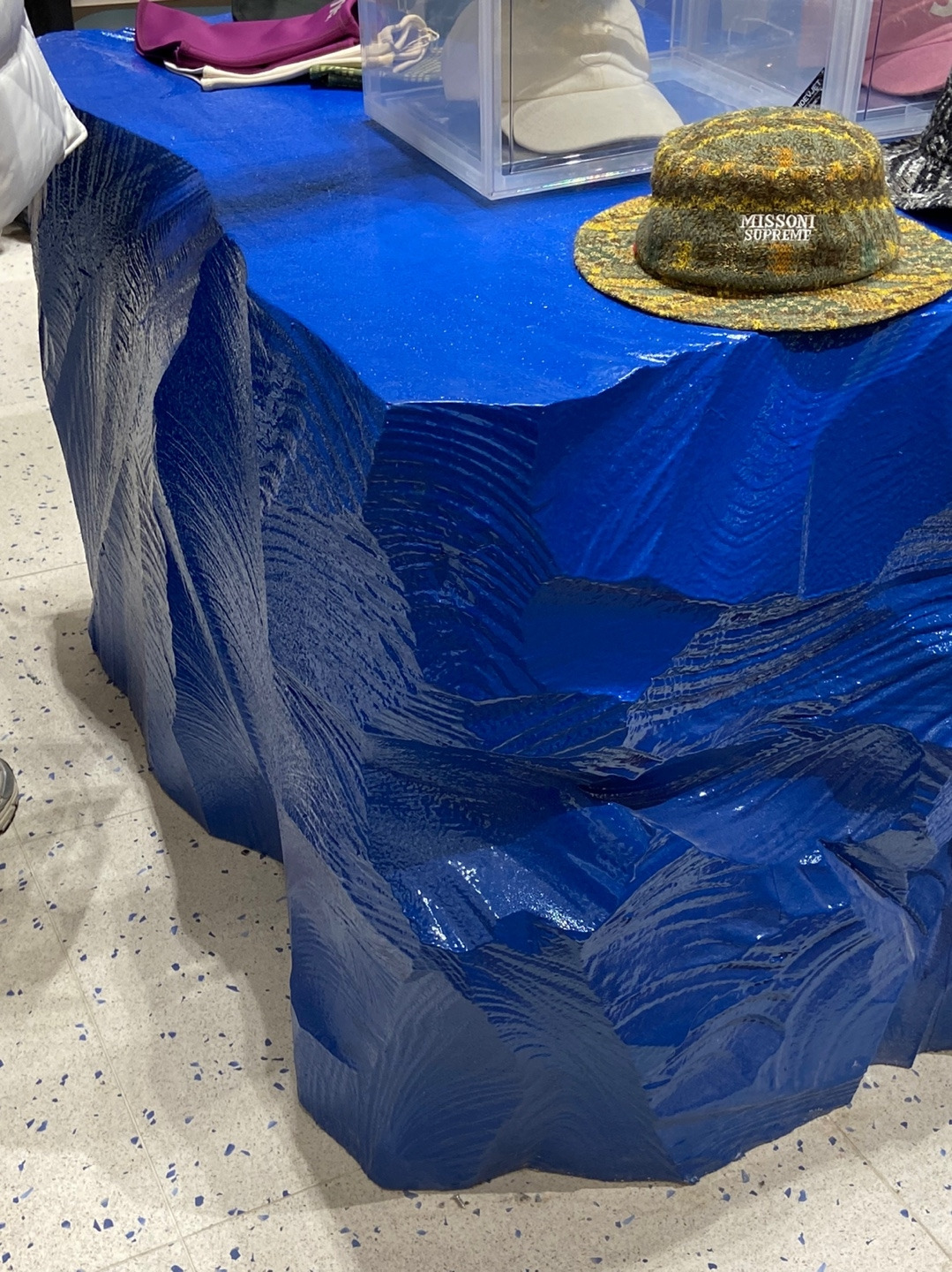 정말 써보고 싶었던 마감재를 만났다.. 작년에 프로젝트를 진행하면서 눈여겨보고 있었던 고무 페인트! 예산과 유지관리 이슈, 국내에 사용했던 레퍼런스가 없어 아쉽게 진행하진 못했었는데 여기서 만나다니! 단단한 강도의 스펀지로 형태를 만들고 위에 고무 페인트를 마감한 듯하다.(확실하진 않지만 다른 해외 레퍼런스에서는 그렇게 사용했다고 함!) 이런 형태는 FRP로도 제작할 수 있으나 제작기간과 금액이 높아서 상대적으로 조금 더 저렴하게 제작할 수 있지 않을까.. 단, 스펀지로 형태를 만드는 게 어렵겠지.. 매장 전체 파티션 월에 사용된 거친 암석 아트월과 유사한 패턴이지만 상반되는 매끈한 마감에 조형적인 오브제의 역할도 한다.