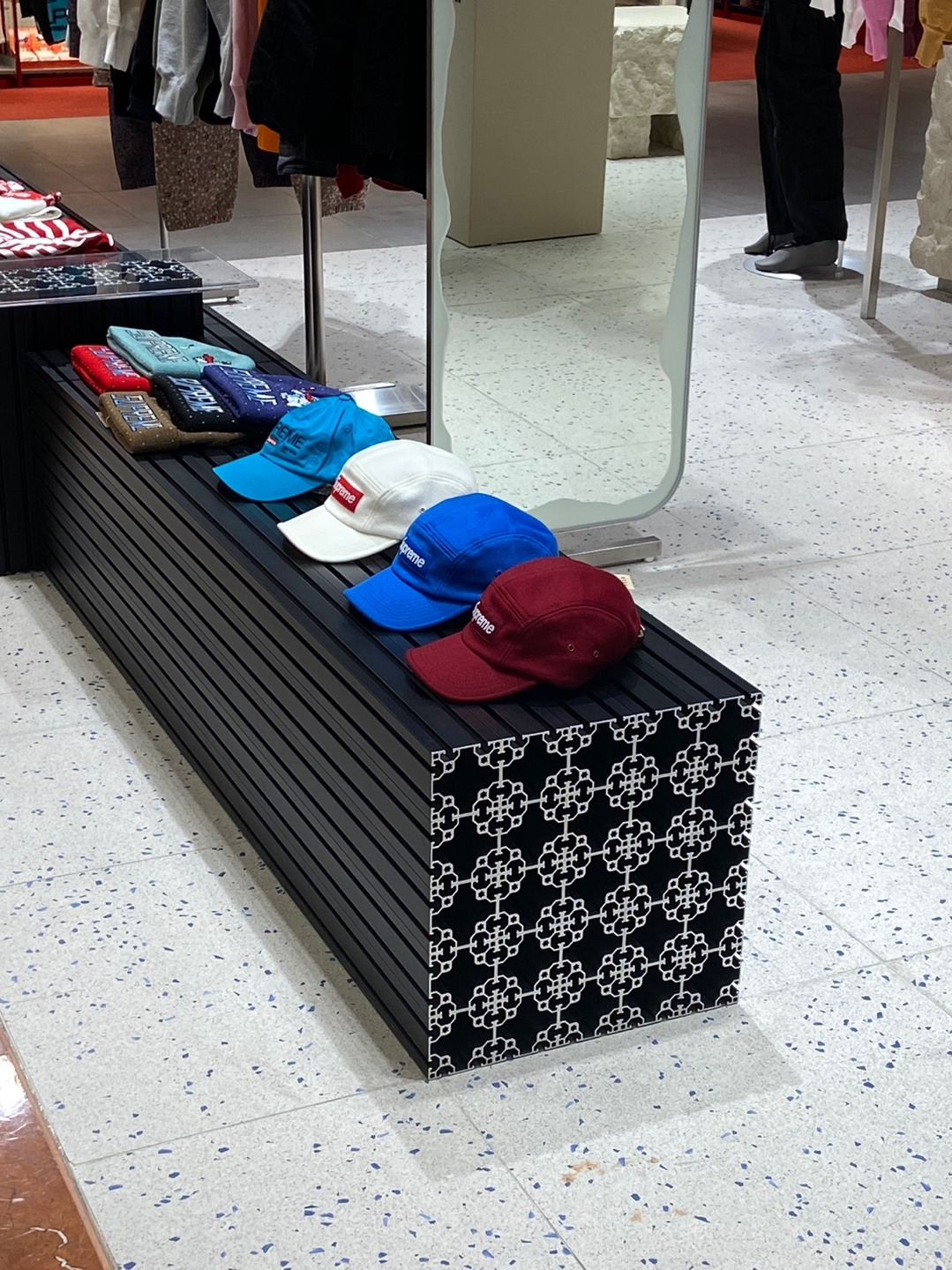 PEER는 MZ문화를 새롭게 발견하는 스트리트 패션 & 컬처 편집샵이다. PEER 매장에서 알루미늄 프로파일은 디스플레이 테이블로 사용된다. 어두운 컬러의 자재를 일률적으로 쌓아놓고 그 위에 브랜드의 다양한 제품을 진열해 놓았다. 전면은 측면의 파여 있는 홈에 맞춰 긴 직선의 패턴이 생긴다. 자재들을 쌓아 놓으니 긴 패턴이 일률적으로 보이며, 측면 또한 특유의 패턴이 하나로 조합되며 전면과는 반대되는 새로운 패턴이 만들어진다. 마감재를 재해석해 디스플레이 테이블로 활용하니 어딘가 모르게 세련된 이미지를 전달한다. 이전에는 알루미늄 프로파일 자체가 저렴하고 투박한 자재로 인식되었다면, 최근에는 마감재를 재해석해 하나의 장식적 요소로 사용하는 것 같다.