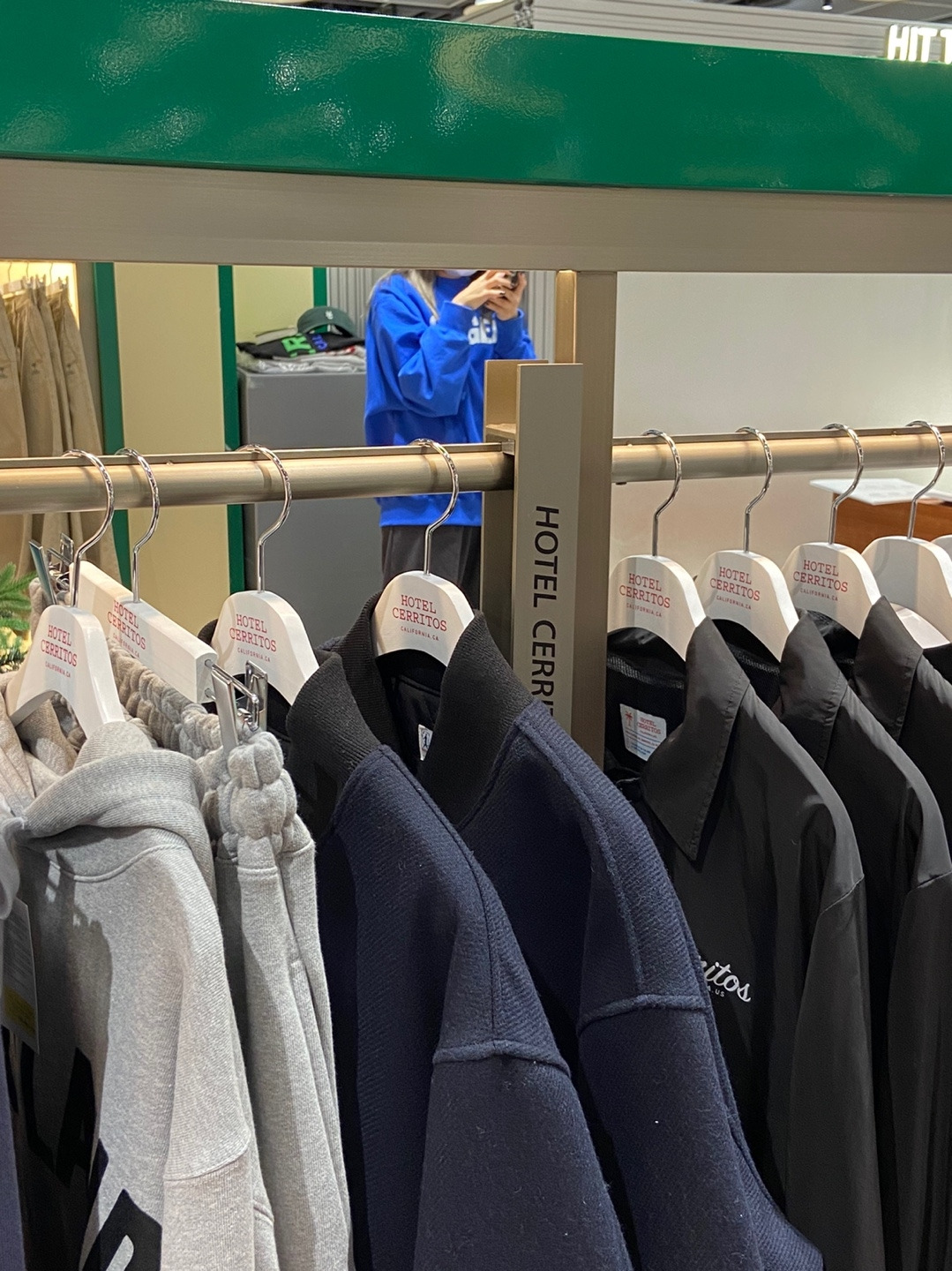 패션 브랜드에서 옷을 진열하기 위해 진열 행거가 필요하다. 매장마다 브랜드 콘셉트와 진열 방식에 따라 매대를 다르게 디자인한다. 호텔 세리토스 매장의 진열 행거를 보면 봉 상단에 봉을 따라서 길고 얇게 턱이 만들어져 있는 것을 볼 수 있다. 원형 봉의 경우 옷을 걸 때 옷걸이가 흘러내릴 수도 있어 봉 상단에 이런 턱을 만들어 놓은 것이다. 그리고 옷걸이로 인해 봉의 도색이 벗겨지는 것도 방지한다. 이런 디테일은 여러 패션 매장에서도 사용한다. 내가 주목했던 것은 진열 행거 별로 함께 연출되어 있는 사이니지다.