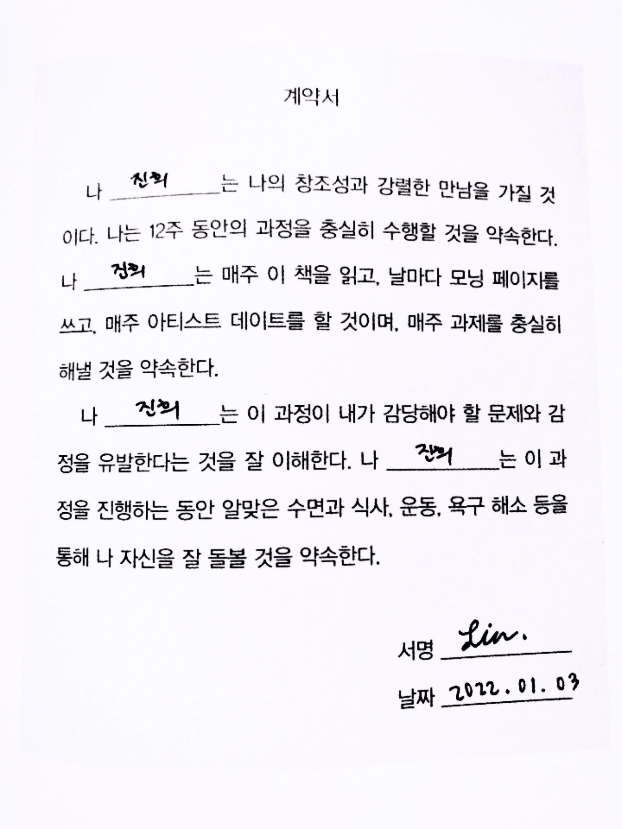 왜 8주 동안 보지 말라고 했는지 추측해보자면, 앞에서 쓴 모닝 페이지를 의식해서 읽을수록 다음 날의 모닝 페이지에 영향이 가기 때문에 보지 말라고 하는 것 같다. 그리고 무조건 세 쪽을 채우라는 이유는 아마도 머릿속에 있는 똥 (...) 들을 완전히 비워내야 하기 때문일까. 이유야 어찌 됐든 나는 책이 시키는 대로 한다.