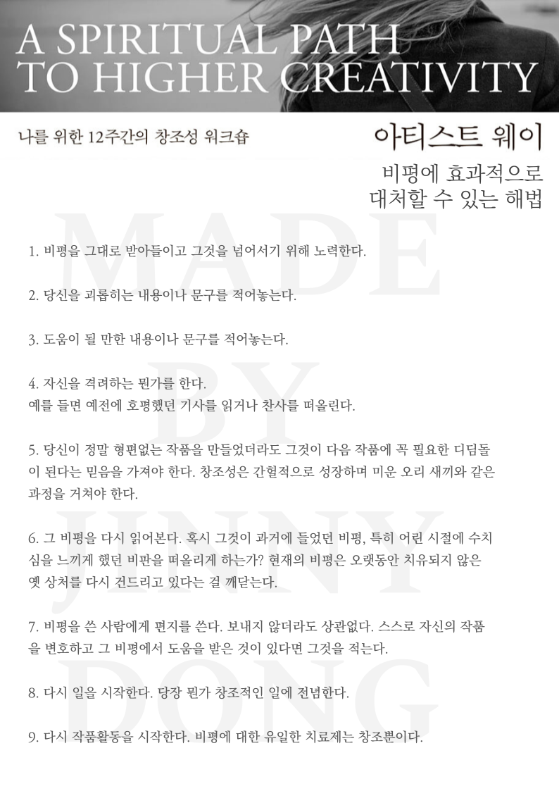 그것은 올바른 비평을 찾는 법을 배워야 한다는 뜻이다. 창조적인 아티스트의 삶을 추구하는 우리는 언제 비평이 필요하고, 누구의 비평이 적절한지를 알아야만 한다. 누가 비평하는지뿐만 아니라 그 시기 또한 중요하다.