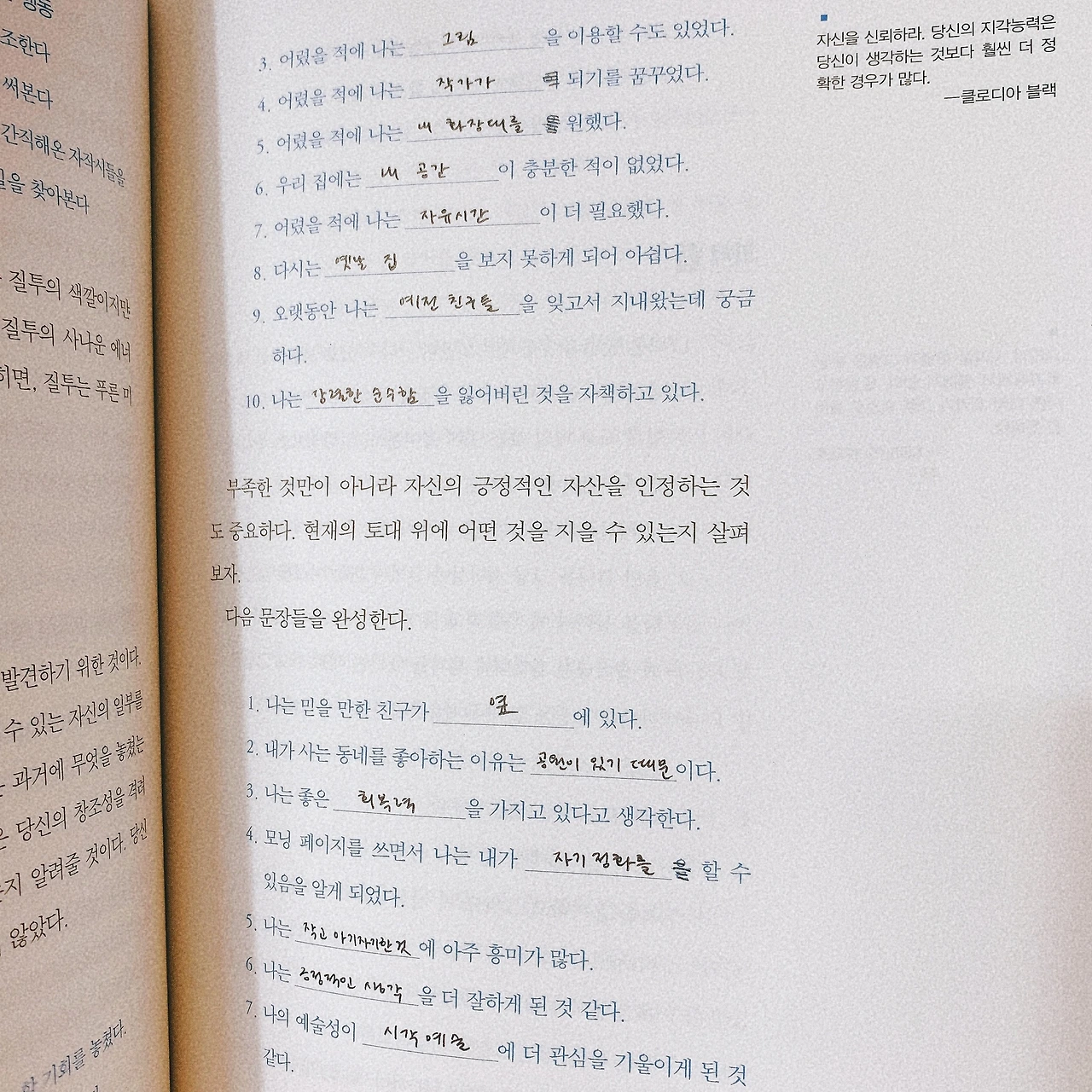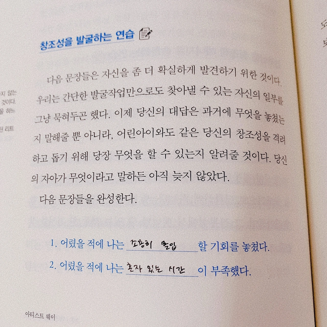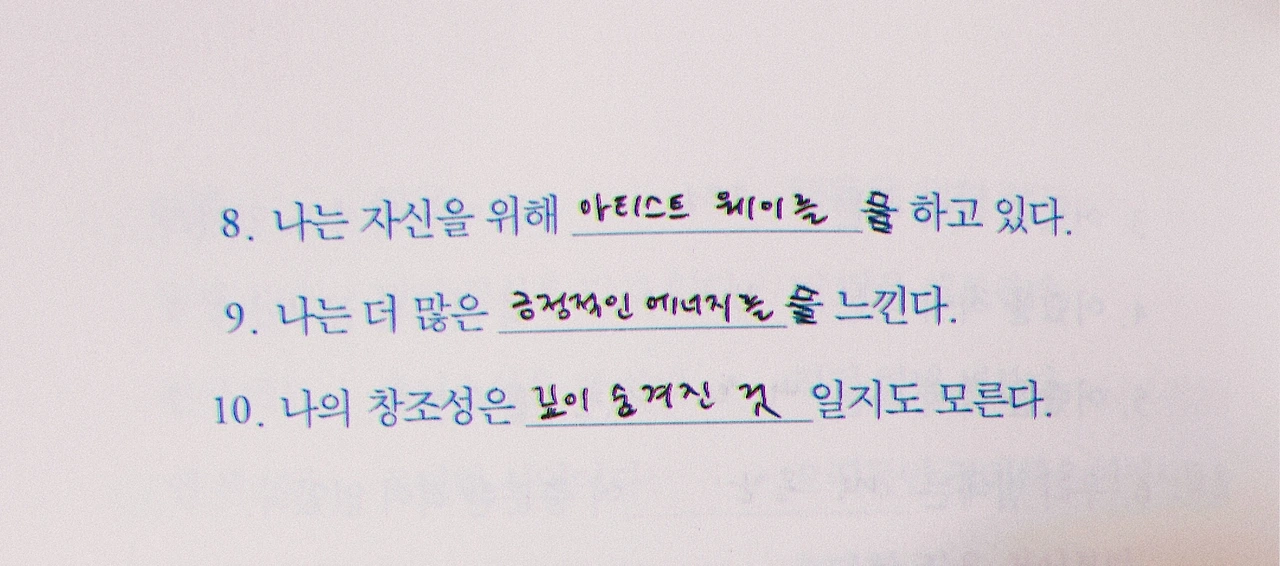 6주 차에 슬럼프가 와서 아티스트 웨이를 질질 끌게 되었다. 하지만 마음을 다시 바로 잡고 아티스트 웨이에 진지하게 임하기로 했다. 나와의 약속은 누구와 하는 약속과도 똑같이 중요하다는 걸 이번에 깨달았다.