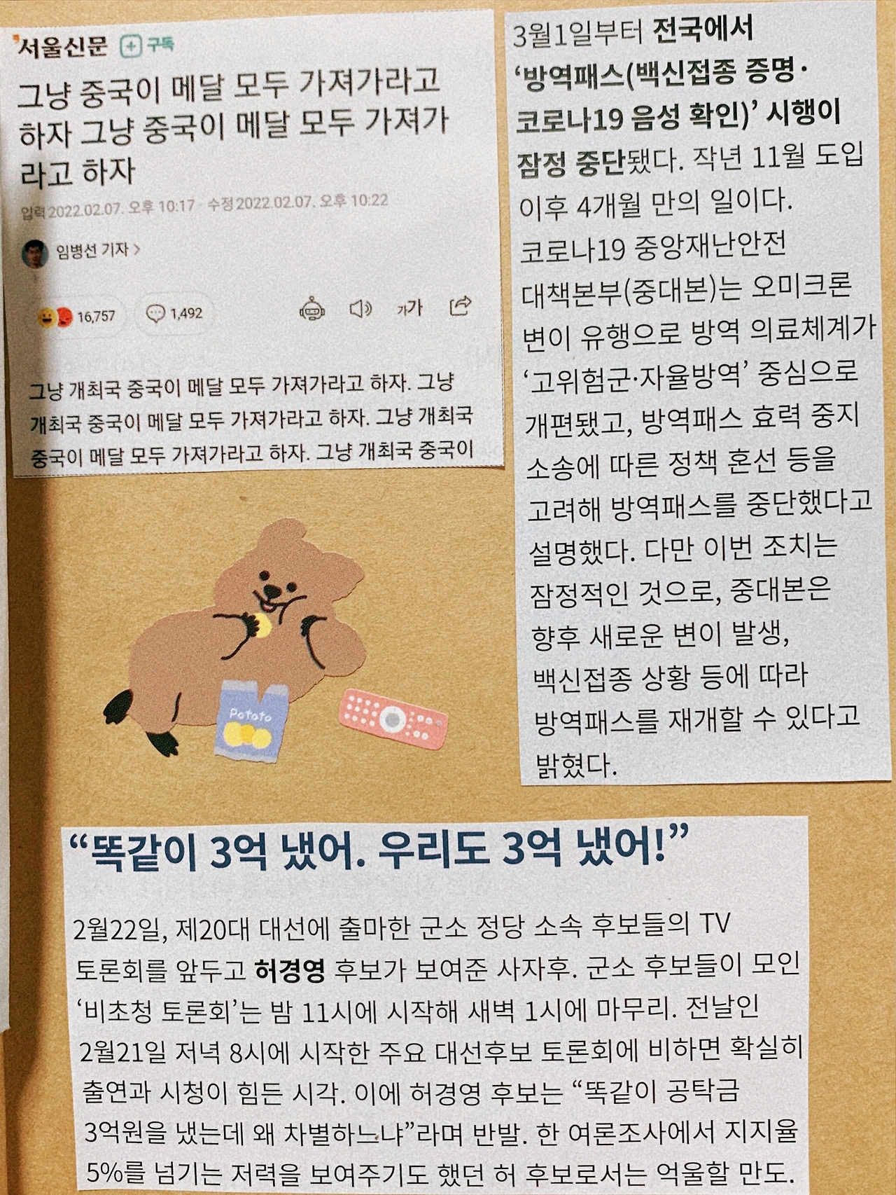 신문은 인터넷으로 읽는 시대지만 과제 때문에 서점에서 주간지를 샀다. 내가 이렇게 아티스트 웨이에 진심인 사람이다. 내가 재밌다고 생각한 기사나 관심 있는 기사를 스크랩했다. 근데 주간지를 잘못 골랐는지 너무 정치적으로 편향된 기사만 수두룩 해서 딱히 기사를 많이 건지지는 못했다. 그치만 어쨌든 과제를 했다는 거!
