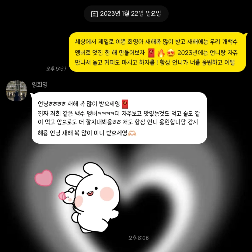설날 당일에 맞춰서 한 해간 고마웠던 사람들에게 감사 인사의 카톡을 거의 다 보내드렸다. 그 중에서도 마음에 드는 답장 2개를 남겨두고 모두 지웠다. 나는 미니멀리스트니까. 이번에 함께 스키장 여행을 간 희영이와 석영이. 아무래도 올해는 또래보다 더 나이 많은 어른들이랑 많이 엮였던 한 해였는데, 감사 편지를 한 명 한 명 보내보니 역시 부담없는 또래 친구가 최고라는 걸 다시 한번 느꼈다. 내가 보낸 진심만큼 진심이 돌아온 기분이 들었다. 다른 사람들에게도 똑같이 감사 인사를 보냈지만, 어쩐지 인연을 마무리하는 인사의 느낌으로 돌아온 답장이 더 많아서 사실 마음이 더 심란해진 것도 사실이다. 그래서 더더욱 희영이와 석영이의 올해는 '함께' 더 재밌게 놀고 '같이' 지내보자는 답장이 마음 속 깊이에 남았다. 더 고맙게 느껴지고 더 특별하게 생각되었다. 이러한 일련의 과정들은 한번씩 꼭 필요하다고 생각한다. 더 물을 주고 햇빛을 쬐어줘야 하는 인연을 돌아보게 한다. 때로는 가려져서 보이지 않던 마음들도 볼 수 있게 해준다. 순수한 행복이 가득한 시간들을 보낼 수 있는 사람들과 함께하는 한 해가 되고 싶다.