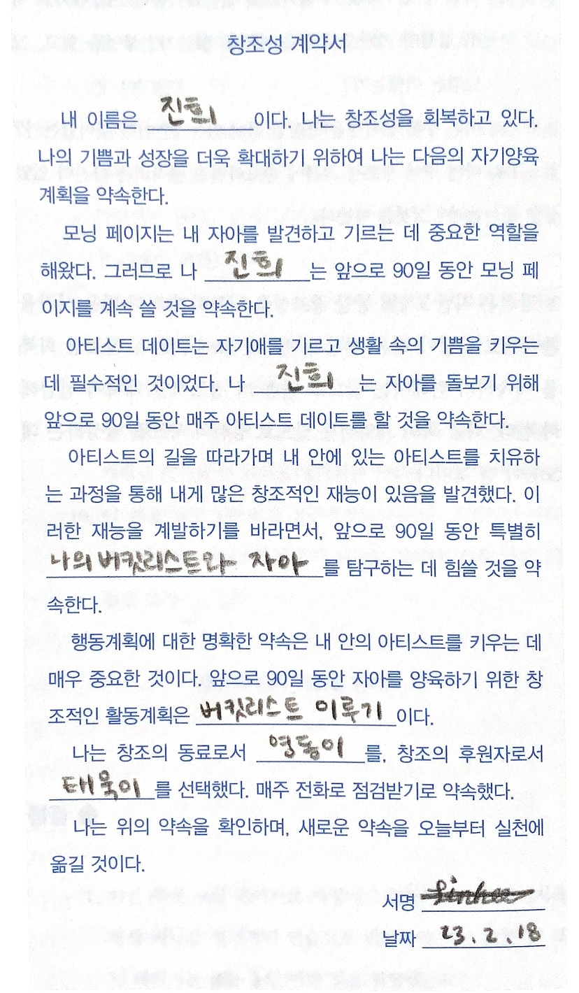 당신은 지난 3개월동안 창조성을 회복하기 위해 많은 시간을 쏟아왔고 나날이 빠른 성장과 변화를 보여주었다. 창조성 회복을 지속하기 위해서는 앞으로 한층 더 창조적인 계획에 전념해야 한다. 다음 쪽의 계약서는 앞으로 당신의 목표를 달성하는 데 도움이 될 것이다.
