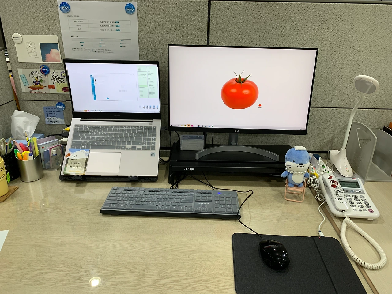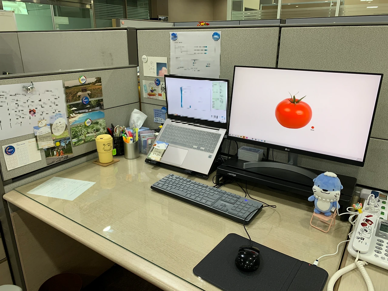 여기가 바로 나의 회사 책상이다. 이전 직장과는 다르게 앞 뒤 옆에 다른 직원들의 자리가 있다. 이전 직장에서는 옆으로 같이 앉고 뒤에는 창문, 앞에는 높은 파티션이 있었는데 여기는 그렇게까지 아늑하지는 않다. 그 아늑함 좋았지만 그러기엔 야근을 너무 많이 시켰지 . . . 아무튼 지금은 그렇지 않으니까 너무 좋다.