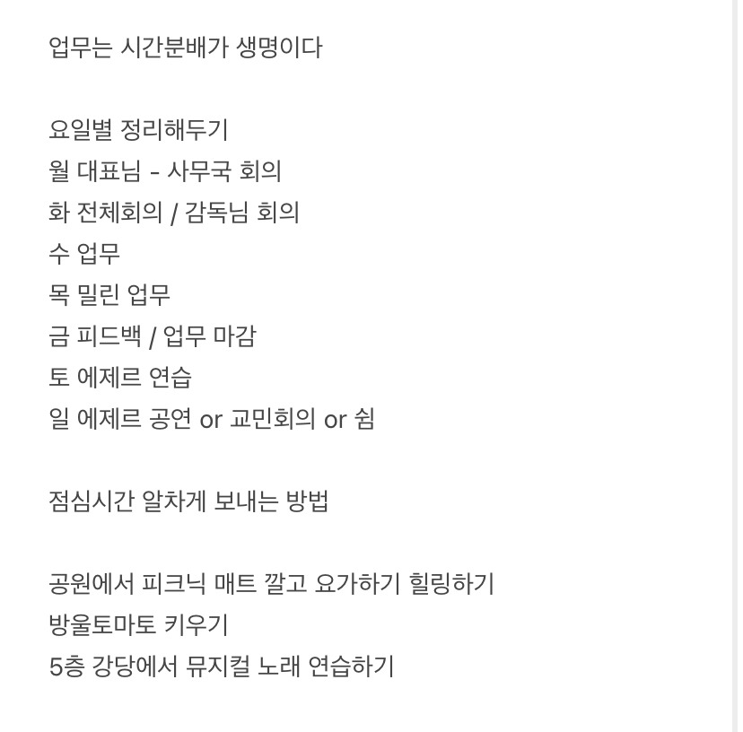 워라밸을 원했던 입사 극초반의 계획. 영혼을 지키는 루틴은 꼭 빠지지 않고 들어가있다. 이때의 메모를 보니 다시 의욕과 열정이 되살아나는 기분이 든다. ( 일에 대한 열정이 아닌 쉼에 대한 열정이 . . . )