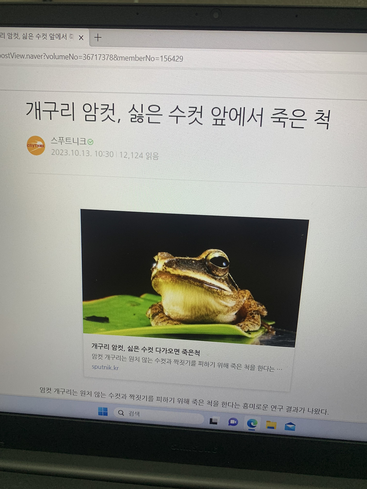 친구 놀릴려고 찍어둔 개구리 관련 기사. 지금 봐도 너무 웃기고 참신한 기사 타이틀. 안 누를 수가 없잖아 !