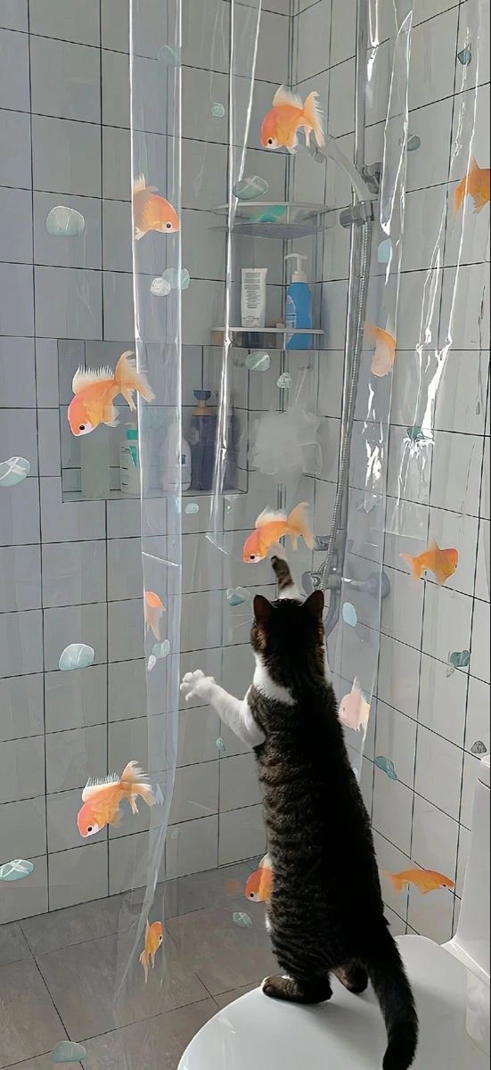 금붕어가 그려진 투명 욕실 커튼. 귀여워 !
