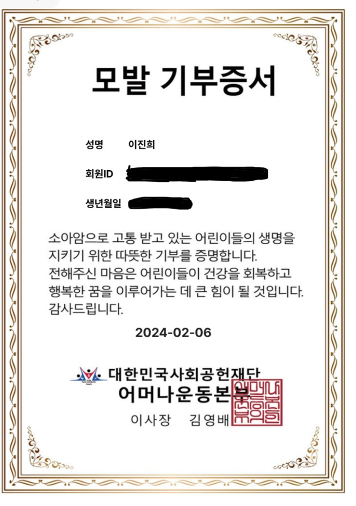 머리카락을 싹둑 자르는 건 진짜 아무렇지도 않았지만 나름 준비물도 챙겨가야 하고 방법도 찾아야 하고 회원가입도 해야하고 미용실 갔다가 우체국 갔다가 여간 귀찮은 일이 아니었다. 귀찮아도 이왕하는 거 기부증서까지 받아보자 ! 해서 없던 끈기를 죄다 끌어모았다. 간단한 응원 메세지도 적어 넣어보내면 좋다길래 메세지도 적어서 넣었다.