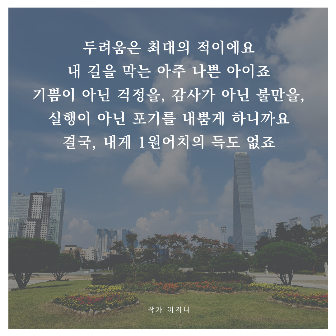 두려움은 최대의 적이에요. 내 길을 막는 아주 나쁜 아이죠. 기쁨이 아닌 걱정을, 감사가 아닌 불만을, 실행이 아닌 포기를 내뿜게 하니까요. 결국, 내게 1원어치의 득도 없죠. 3년 전으로 돌아간다고 해도 같은 결정을 했을지 모르지만, 지금이라도 두려움을 벗어 얼마나 감사한지요.