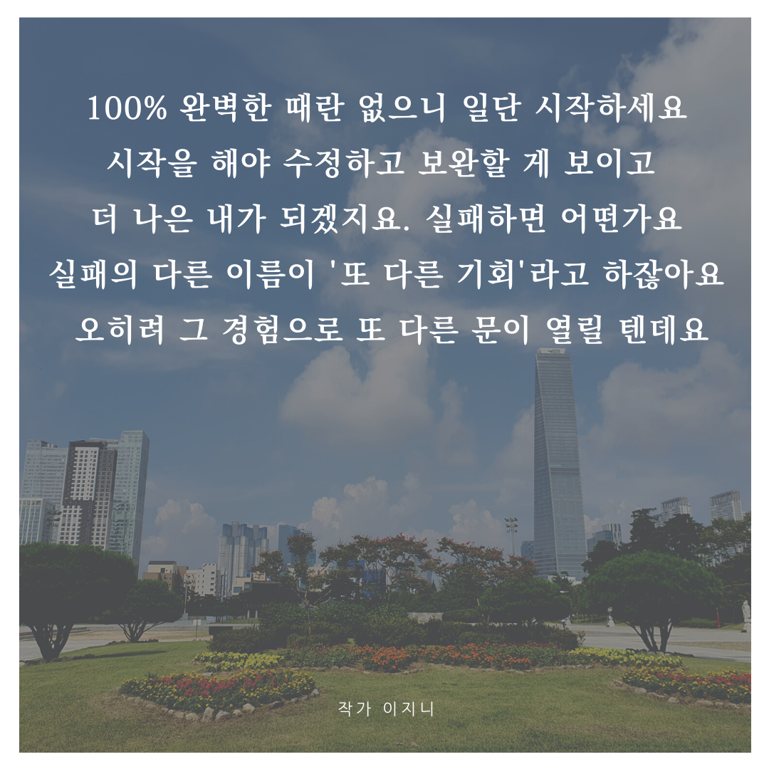 더 완벽한 때! 내가 준비됐을 때! 그때 기회를 잡겠다? 누가 다시 와 준다고 하나요? 100% 완벽한 때란 없으니 일단 시작하세요. 시작을 해야 수정하고 보완할 게 보이고 더 나은 내가 되겠지요. 실패하면 어떤가요. 실패의 다른 이름이 '또 다른 기회'라고 하잖아요. 오히려 그 경험으로 또 다른 문이 열릴 텐데요.
