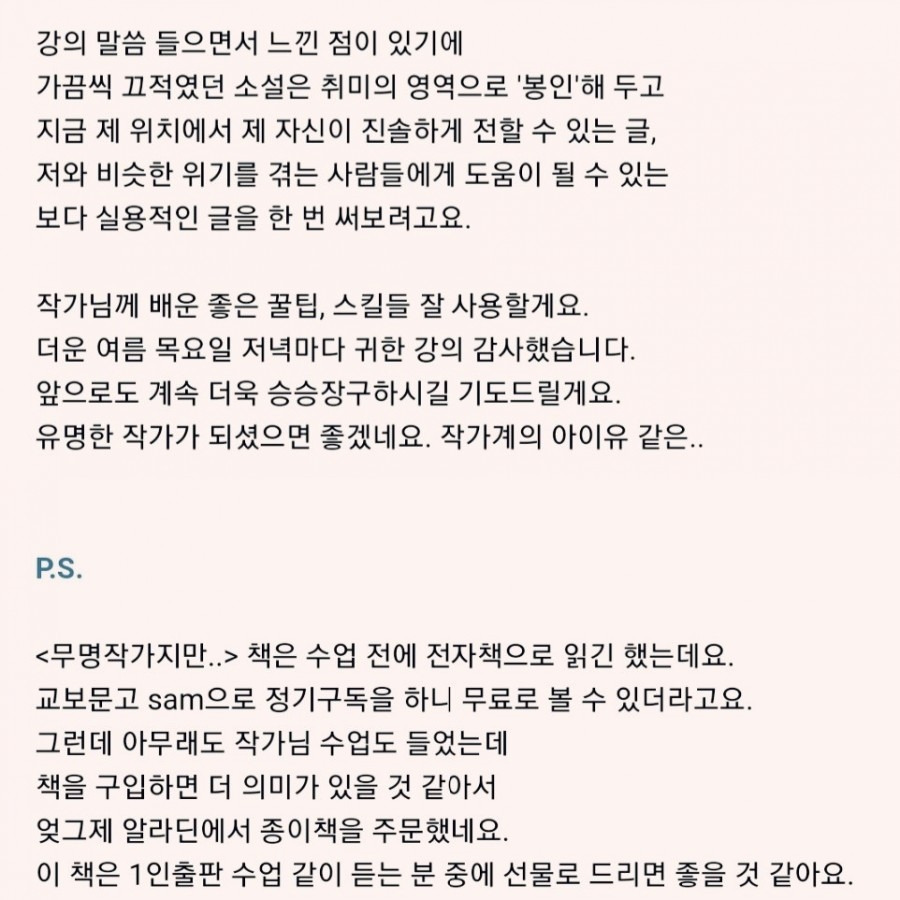 책 쓰기에 관한 전반적인 이야기를 듣고 누군가는 '이 내용을 내가 알아야 하나?'라고 생각할 테고, 또다른 누군가는 '그래, 알아두면 좋겠다. 반드시 활용해야지!'라며 메모하지요. K 님처럼 마음이 따스해지는 메일을 보내 주시기도 하고요. 수업 때마다 호응을 잘해 주셔서 더없이 감사했는데 역시나,였어요.