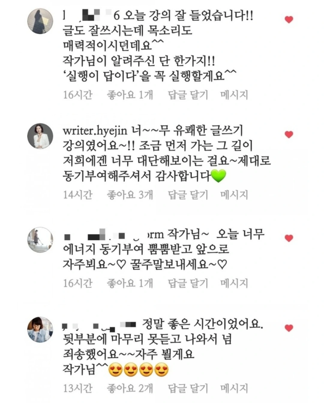 프로필 촬영 이야기는 수정본이 나오면 그때 따로 포스팅하기로 하고! 저녁 7시에 또 다른 특강을 진행했어요. 2시간 동안 글쓰기에 관한 전반적인 이야기를 전했습니다. 글쓰기 팁이나 퇴고 방법 등 알려드리고 싶은 것이 많아, 말이 점점 빨라졌어요. 이런... 특강이 끝나고 질의응답 시간에 한 남성분이, "기대한 것보다 강의 내용이 훨씬 더 알차고 좋았습니다. 특강 비용이 2만 원인데, 강의 퀄리티에 비해 너무 저렴한 거 아닌가요? 몇 십만 원짜리 그 이상이었습니다. 고맙습니다, 작가님." 참여하신 모든 분의 소감을 듣진 못했지만, 이 분의 한마디로 오늘 하루가 보람있고, 뿌듯하고, 행복하고, 기뻤어요. 정말 감사합니다.